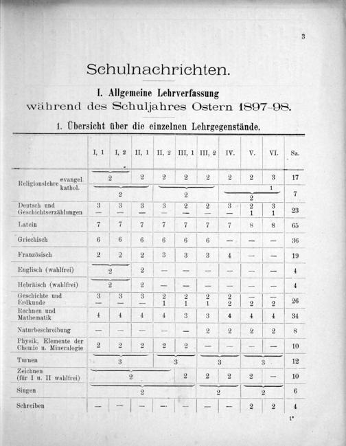 1, 1 I, 2 V. VI. Sa. ——— S—— 2 2 2 2 2 2 2 2 3 17 Religionslehre vangel.———— kathol.— 1 2 V 2 2 7 Deutsch und 36 33 3 2 2 13 2 3 23 Geschichtserzählungen——————— 1 1 Latein 7 7 7 7 7 7 7 8 8 65 ——————— Griechisch 6 6 6 6 V 6 6——— 36 Französisch 2 2 2 3 V 3 53 4—— 19 Englisch(wahlfrei) 2 2— V——— V—— 4 —————— Hebräisch(wahlfrei) 2 2— V——— V—— 4 Geschichte nn˙d 3 3 32 2 2 2—— 26 Erdkunde 3——— 1 ₰—. 1 3 1 2 I 21 2 Rechnen und Mathematik 4 4 4 43 3 4 4 4 31 Naturbeschreibung— V———— 2 2 2 2 8 Physik, Elemente der„* Chemie u. Mineralogie 2 2 5 3 2 V— 10 Turnen 3 3 3 3 12 Zeichnen 4„ o„ (für I u. II wahlfrei) 2 2 2 2 ⸗ 10 Singen 2 V 2 2 6 —— 82— Schreiben——— V———— 2 2 4