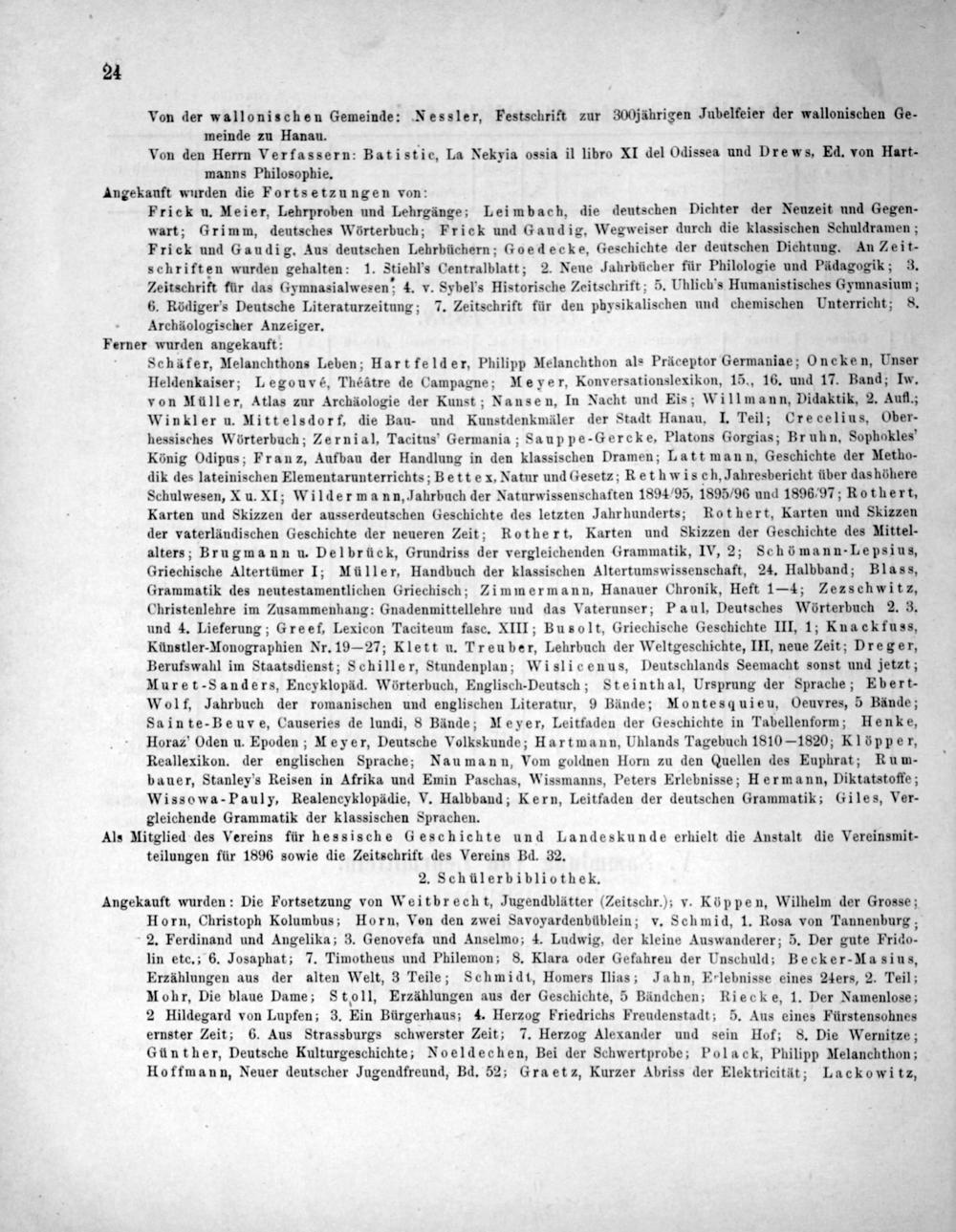 Peruer wurden angekauft: Schäfer, Melanchthons Leben; Hartfelder, Philipp Melanchthon als Präceptor Germaniae; Oncken, Unser Heldenkaiser; Legouvé, Théatre de Campagne; Meyer, Konversationslexikon, 15., 16. und 17. Band; Iw. von Müller, Atlas zur Archäologie der Kunst; Nansen, In Nacht und Eis; Willmann, Didaktik, 2. Aufl.; Winkler u. Mittelsdorf, die Bau- und Kunstdenkmäler der Stadt Hanau, I. Teil; Crecelius, Ober- hessisches Wörterbuch; Zernial, Tacitus' Germania; Sauppe-Gercke, Platons Gorgias; Bruhn, Sophokles' König Odipus; Franz, Aufbau der Handlung in den klassischen Dramen; Latt mann, Geschichte der Metho- dik des lateinischen Elementarunterrichts; Bettex. Natur und Gesetz; Rethwisch, Jahresbericht über dashöhere Schulwesen, X u. Xl; Wildermann, Jahrbuch der Naturwissenschaften 1894/95, 1895 /96 und 1896/97; Rothert, Karten und Skizzen der ausserdeutschen Geschichte des letzten Jahrhunderts; Rothert, Karten und Skizzen der vaterländischen Geschichte der neueren Zeit; Rothert, Karten und Sskizzen der Geschichte des Mittel- alters; Brugmann u. Delbrück, Grundriss der vergleichenden Grammatik, IV, 2; Schömann-Lepsius, Griechische Altertümer I; Müller, Handbuch der klassischen Altertumswissenschaft, 24. Halbband; Blass, Grammatik des neutestamentlichen Griechisch; Zimmermann, Hanauer Chronik, Heft 1—4; Zezschwitz. Christenlehre im Zusammenhang: Gnadenmittellehre und das Vaterunser; Paul, Deutsches Wörterbuch 2. 3. und 4. Lieferung; Greef, Lexicon Taciteum fasc. XIII; Busolt, Griechische Geschichte III, 1; Knackfuss, Künstler-Monographien Nr. 19— 27; Klett u. Treuber, Lehrbuch der Weltgeschichte, III, neue Zeit; Dreger, Berufswahl im Staatsdienst; Schiller, Stundenplan; Wislicenus, Deutschlands Seemacht sonst und jetzt; Muret-Sanders, Encyklopäd. Wörterbuch, Englisch-Deutsch; Steinthal, Ursprung der Sprache; Ebert- Wolf, Jahrbuch der romanischen und englischen Literatur, 9 Bände; Montesquieu, Oeuyvres, 5 Bände; Sainte-Beuve, Causeries de lundi, 8 Bände; Meyer, Leitfaden der Geschichte in Tabellenform; Henke, Horaz' Oden u. Epoden; Meyer, Deutsche Volkskunde; Hartmann, Uhlands Tagebuch 1810— 1820; Klöpper, Reallexikon. der englischen Sprache; Nau mann, Vom goldnen Horn zu den Quellen des Euphrat; Rum- bauer, Stanley's Reisen in Afrika und Emin Paschas, Wissmanns, Peters Erlebnisse; Hermann, Diktatstoffe; Wissowa-Pauly, Realencyklopädie, V. Halbband; Kern, Leitfaden der deutschen Grammatik; Giles, Ver- gleichende Grammatik der klassischen Sprachen.