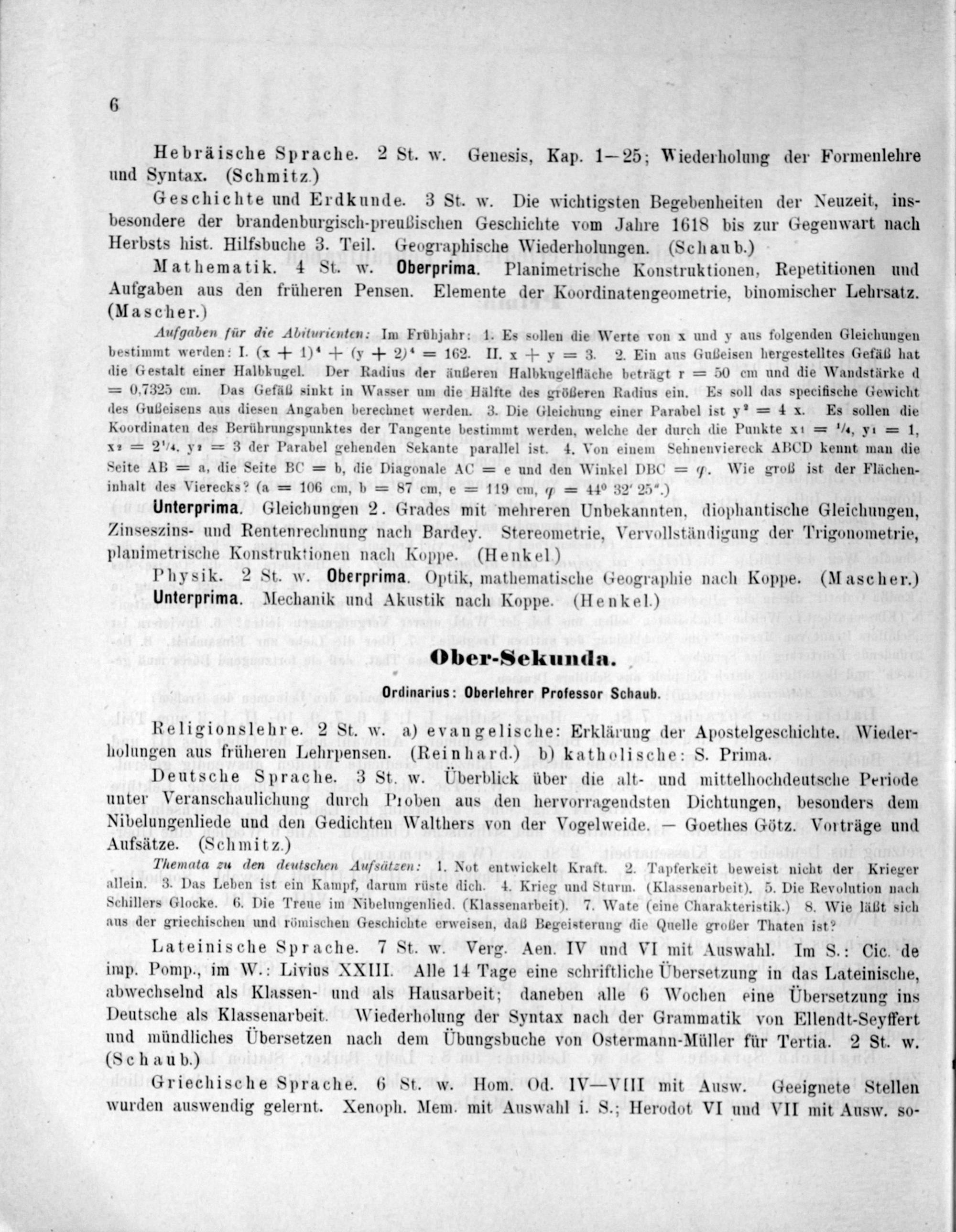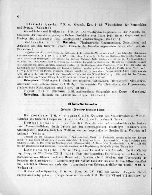 Lateinische Sprache. 7 St. w. Verg. Aen. IV und VI mit Auswahl. Im S.: Cic. de imp. Pomp., im W.: Livius XXIII. Alle 14 Tage eine schriftliche Übersetzung in das Lateinische, abwechselnd als Klassen- und als Hausarbeit; daneben alle 6 Wochen eine Übersetzung ins Deutsche als Klassenarbeit. W iederholung der Syntax nach der Grammatik von Ellendt-Seyffert und mündliches Übersetzen nach dem Ubungsbuche von Ostermann-Müller für Tertia. 2 St. w. (Schaub.)