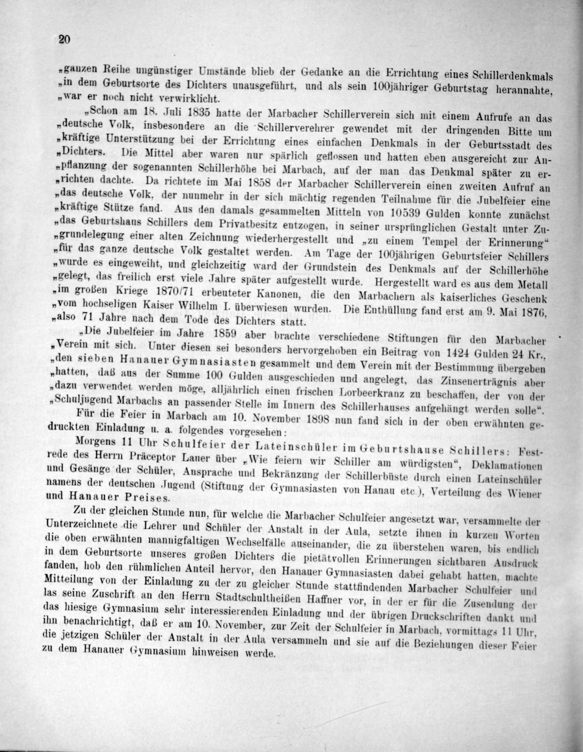 „Schon am 18. Juli 1835 hatte der Marbacher Schillerverein sich mit einem Aufrufe an das „deutsche Volk, insbesondere an die Schillerverehrer gewendet mit der dringenden Bitte um „kräftige Unterstützung bei der Errichtung eines einfachen Denkmals in der Geburtsstadt des „Dichters. Die Mittel aber waren nur spärlich geflossen und hatten eben ausgereicht zur An- „Pflanzung der sogenannten Schillerhöhe bei Marbach, auf der man das Denkmal später zu er- „richten dachte. Da richtete im Mai 1858 der Marbacher Schillerverein einen zweiten Aufruf an „das deutsche Volk, der nunmehr in der sich mächtig regenden Teilnahme für die Jubelfeier eine „kräftige Stütze fand. Aus den damals gesammelten Mitteln von 10539 Gulden konnte zunächst „das Geburtshaus Schillers dem Privatbesitz entzogen, in seiner ursprünglichen Gestalt unter Zu- „grundelegung einer alten Zeichnung wiederhergestellt und„zu einem Tempel der Erinnerung“ „für das ganze deutsche Volk gestaltet werden. Am Tage der 100 jährigen Geburtsfeier Schillers „wurde es eingeweiht, und gleichzeitig ward der Grundstein des Denkmals auf der Schillerhöhe „gelegt, das freilich erst viele Jahre später aufgestellt wurde. Hergestellt ward es aus dem Metall „im großen Kriege 1870/71 erbeuteter Kanonen, die den Marbachern als kaiserliches Geschenk „»vom hochseligen Kaiser Wilhelm I. überwiesen wurden. Die Enthüllung fand erst am 9. Mai 1876, „also 71 Jahre nach dem Tode des Dichters statt.