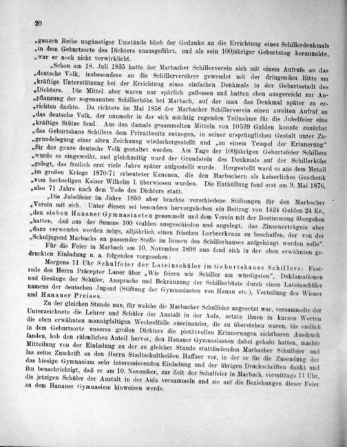 Zu der gleichen Stunde nun, für welche die Marbacher Schulfeier angesetzt war, versammelte der Unterzeichnete die Lehrer und Schüler der Anstalt in der Aula. setzte ihnen in kurzen Worten die oben erwähnten mannigfaltigen Wechselfälle auseinander, die zu überstehen waren, bis endlich in dem Geburtsorte unseres großen Dichters die pietätvollen Erinnerungen sichtbaren Ausdruck fanden, hob den rühmlichen Anteil hervor, den Hanauer Gymnasiasten dabei gehabt hatten, machte Mitteilung von der Einladung zu der zu gleicher Stunde stattfindenden Marbacher Schulfeier und las seine Zuschrift an den Herrn Stadtschultheißen Haffner vor, in der er für die Zusendung der das hiesige Gymnasium sehr interessierenden Einladung und der übrigen Druckschriften dankt und ihn benachrichtigt, daß er am 10. November, zur Zeit der Schulteier in Marbach, vormittags 11 Uhr, die jetzigen Schüler der Austalt in der Aula versammeln und sie auf die Beziehungen dieser Feier zu dem Hanauer Gymnasium hinweisen werde.