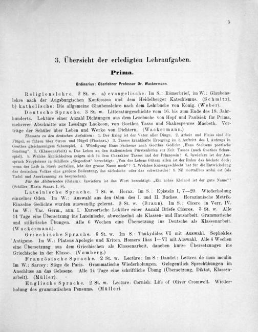 3. Übersicht der erledigten Lehraufgaben. Prima. Ordinarius: Oberlehrer Professor Dr. Wackermann.
