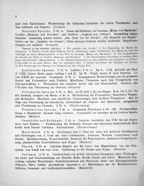 Themata zu den deutschen Aufsätzen: 1. Wie entsteht eine Glocke? 2. Die Eumeniden, die Macht des Gewissens. 3. Welche Grunde fuhrt Tellheim für die Aufhebung seines Verlöbnisses mit Minna an, und wie widerlegt sie diese?(Klassenarbeit.) 4. Der Wirt in Lessings„Minna von Barnhelm“. 5. Die Vorgeschichte der Familie des Wirts in Goethes„Hermann und Dorothea“. 6. Die Personlichkeit Dorotheas in Goethes„Her- mann und Dorothea“(Klassenarbeit). 7. Der Zustand Frankreichs vor dem Auftreten der Jungfrau von Orleans. 8. Das Geld ist ein guter Diener, aber ein schlimmer Herr. 9. Schuld und Suhne der Jungfrau von Orleans. 10. Die Versohnung des Herzogs von Burgund mit dem Könige Karl.