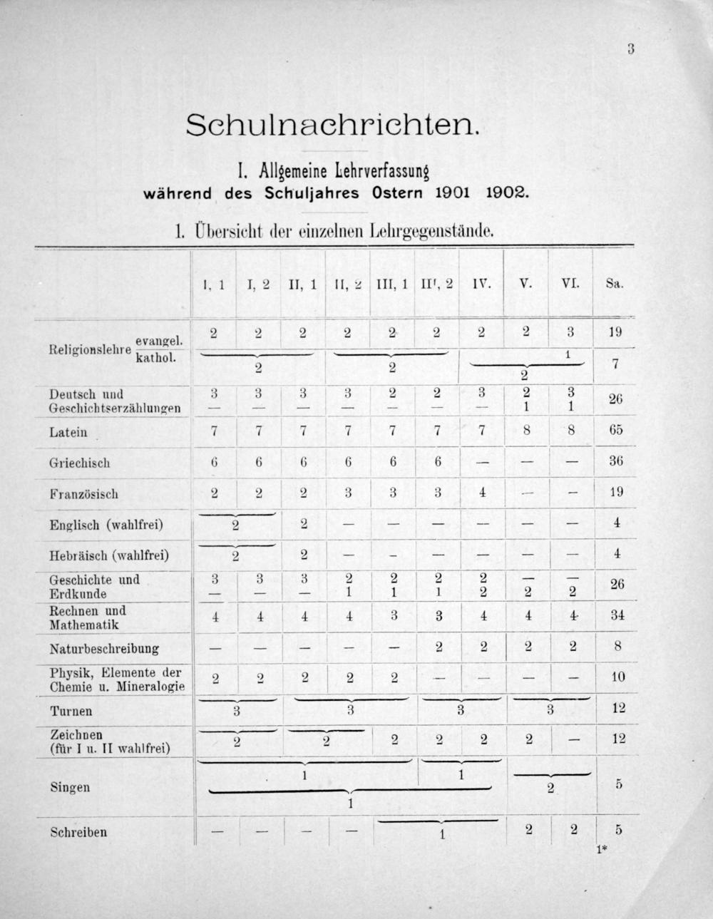 I. Allgemeine Lehrverfassung während des Schuljahres Ostern 1901 1902.