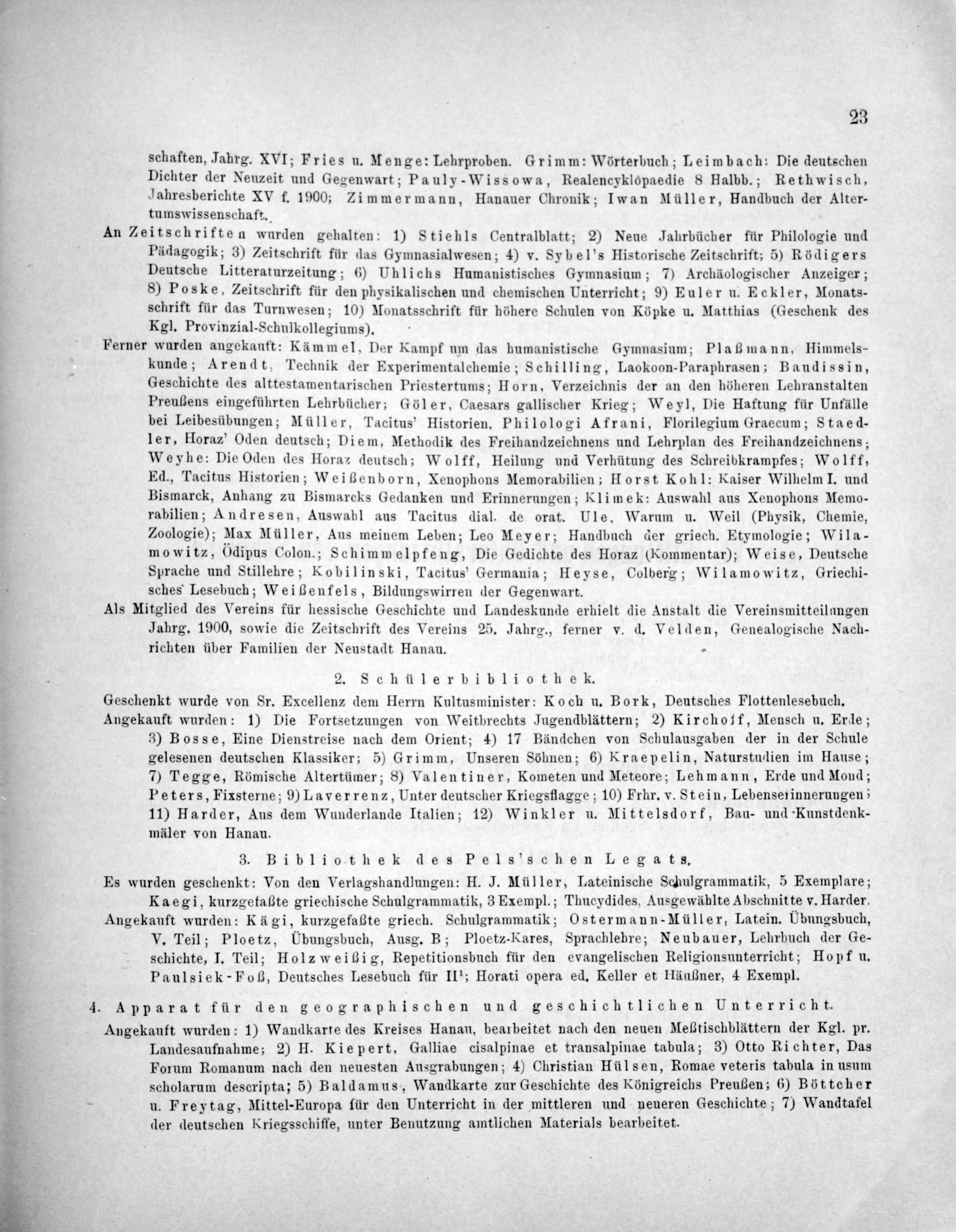 Als Mitglied des Vereins für hessische Geschichte und Landeskunde erhielt die Anstalt die Vereinsmitteilungen Jahrg. 1900, sowie die Zeitschrift des Vereins 25. Jahrg., ferner v. d. Velden, Genealogische Nach-