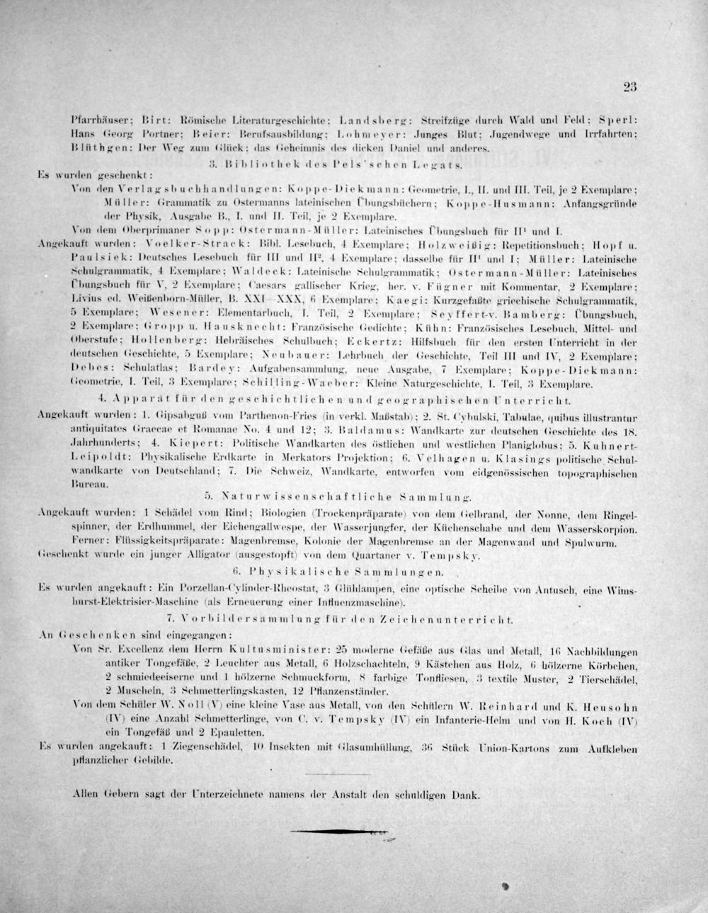 Von dem Schüler W. NoI V) eine kleine Vase aus Metall, von den Schülern W. Reinhard und K. Heusohn (IV) eine Anzahl Schmetterlinge, von C. v. Tempskv(IV) ein Infanterie-Helm und von II. Koch(IV) ein Tongefäß und 2 Epauletten.