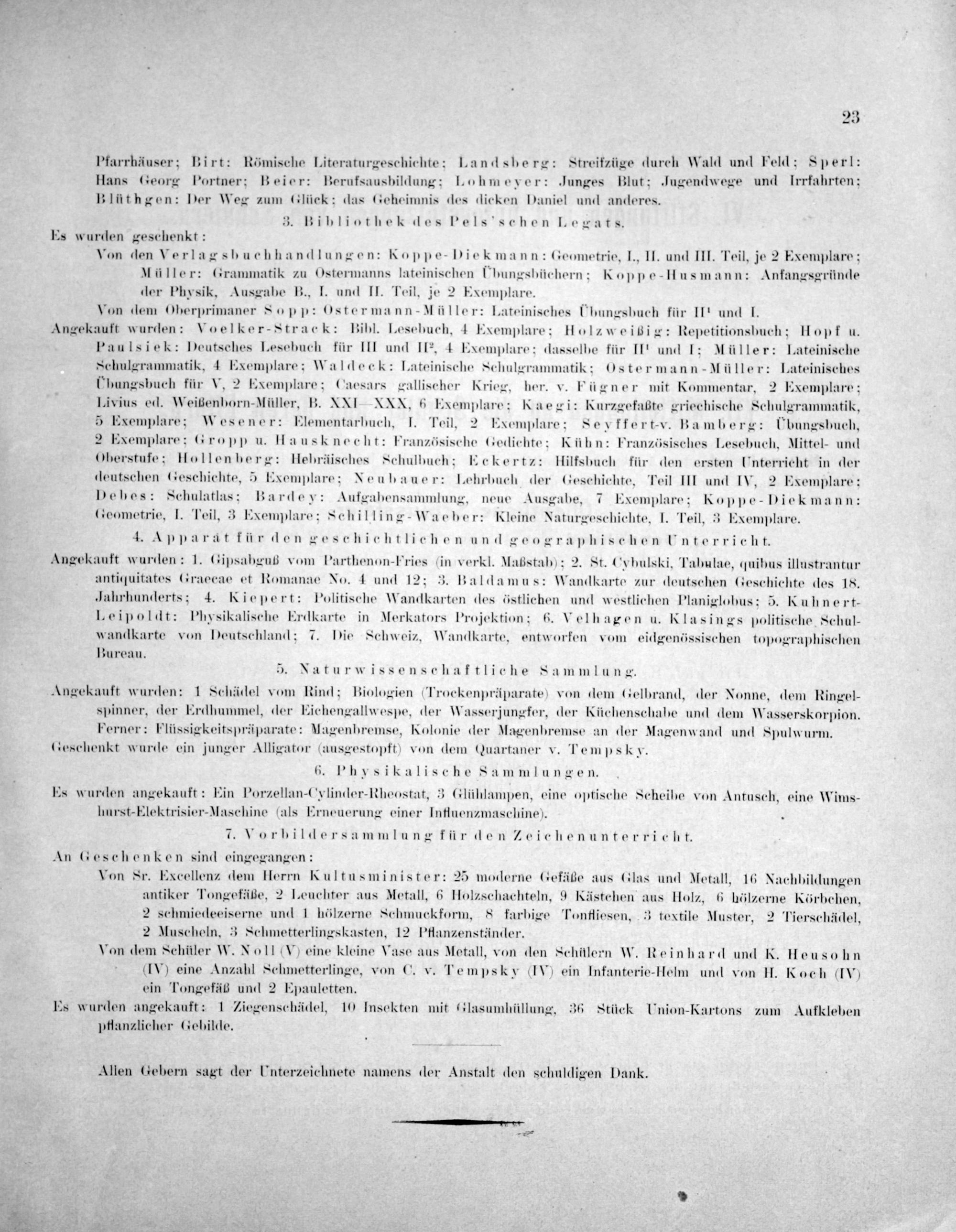 Von den Verlagsbuchhandlungen: Koppe-Diekmann: Geometrie, I., II. und III. Teil, je 2 Exemplare; Müller: Grammatik zu Ostermanns lateinischen ſ'hungsbüchern:; K oppe-Husmann: Anfangsgründe der Physik, Ausgabe B., I. und II. Teil, je 2 Exemplare.
