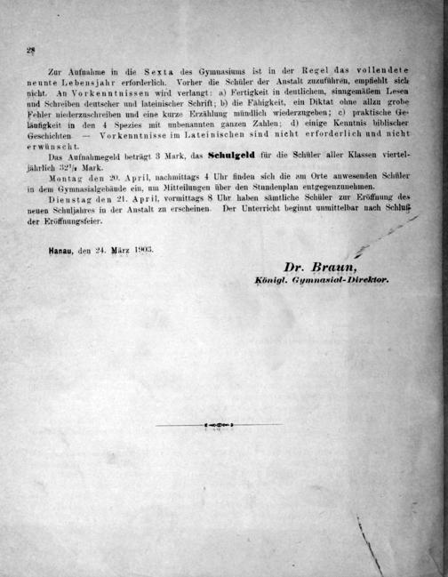 in dem Gymnasialgebäude ein, um Mitteilungen über den Stundenplan entgegenzunehmen.. Dieunstag den 21. April, vormittags 8 Uhr haben sämtliche Schüler zur Eröffuung des neuen Schuljahres in der Anstalt zu erscheinen. Der Unterricht beginnt unmittelbar nach Schluß