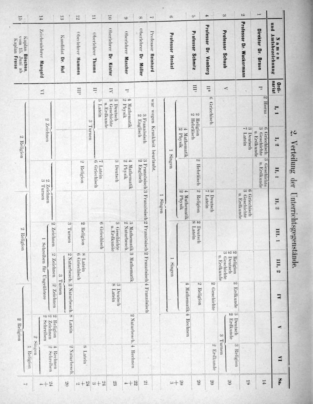Namen Ordi-. 2— b und Amtsbezeichnung nariat 1 1 1, 2 II, 1 II, 2 1II. 1 111, 2 IV. VI sa. 2 Horaz 6 Griechisch 3 Geschichte 1 Direktor Dr. Braun I* 3 Geschichte u. Erdkunde 14 u. Erdlunde 3 Deutsch—6 Griechisch 4 2 Professor Dr. Wackermann 7 Latein 3 Geschichte 19 u. Erdkunde. b b 2 Religion 2 Erdkunde 3 Deutsch 3 Re igion „ 2 Deutse 2 2 3 1 3 Professor Schaub v 2 Deutsch Erdkumde 20 3 Geschichte u. Erdkunde 3 Turnen 6 Griechiscl 2 eutsc 2 ichte 2 Erdk 8 4 professor Dr. Vomberg Iz 6 Griechisch 3 Pe utsch 2 Geschichte Erdkunde 20 7 Latein . 4 2 Religion 2 Hebräisch 2 Religion 2 Deutsch 2 Religion 1 8 2 5 20 5 Professor Schmitz IIIl 2 sch 8 Latein 1.— 1— 4 Mathematik 4 Mathematik 4 Mathematik4 Rechnen 2 Physik 2 Physik 20 6 Professor Henkel 1 Singen 1 Singen 4 1 Singen 7 l'rofessor Reinhard war wegen Krankheit beurlaubt. 8 Oberlehrer Dr. Mülter 3 ran⸗halse h3 Französisch 2 Französisch2 Französisch4 Französisch 21 22 4 Mathematik 4 Mathematik 3 Mathematik 3 Mathematik 2 Naturbesch. 4 Rechnen 5 8 Oberlehrer 1 2 6 9 berlehrer Mascher 1 2 Physik 2 Physik 2 Naturbesch. 4 3 Deutseh 3 Deutsch 3 Geschichte 3 Deutsch 10 Oberlehrer Dr. Küster IV 3 Geschichte u. Erdkunde 8 Latein 23 u. Erdkunde 5 Latein 7 Latein 6 Griechisch 24 11 Oberlehrer Thieme 11' 6 Griechisch— 3 Turnen 3 2 Religi S Latei 81 24 12 Oberlehrer Hammes IIl* 5 2 Religion 8 Latein 8 I.ate+ 6 Griechisch 5 4 3 Turnen 2 Naturbesch. 2 Naturbesch. 8 Latein 2 Naturbesch. 13 Kandidat Dr. Hof 20 3 Turnen 2 Zeichnen 2 Zeichnen 2 Zeichnen 2 Rel 4 Rechnen 2 Zeiehnen 2 Zeichnen 2 LZeichnen 2 24 14 Zeichenlehrer Mangold VI 3 Turnen 1 Schreiben für Ungeübtere 2 Schreiben+ 1 2 Raplan Böschen, 15 m 15. Juni ab 2 1 2 Religion 7