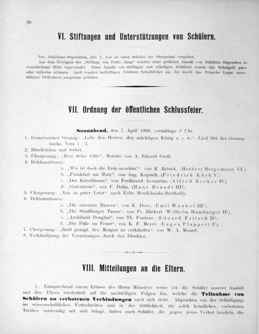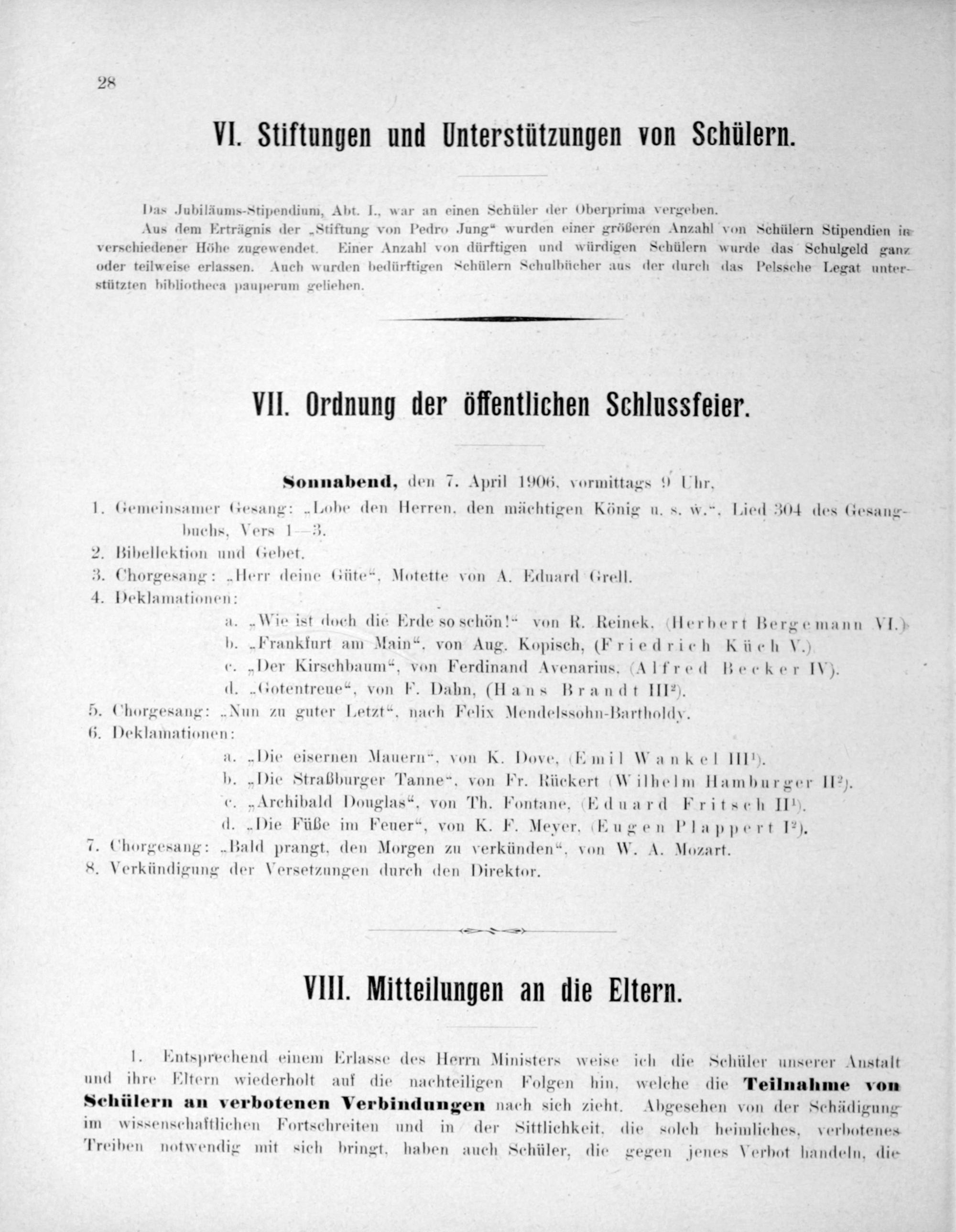 5. Chorgesang:„Nun zu guter Letzte, nach Felix Mendelssohn-Bartholdy. 6. Deklamationen: a.„Die eisernen Mauern“, von K. Dove, CEmil Wankel III). b.„Die Straßburger Tanner, von Fr. Rückert Wilhelm Hamburger II c.„Archibald Douglas“, von Th. Fontane. E duard Fritsch II). d.„Die Füße im Feuer“, von K. F. Meyer, Eugen Plappert 1l*).