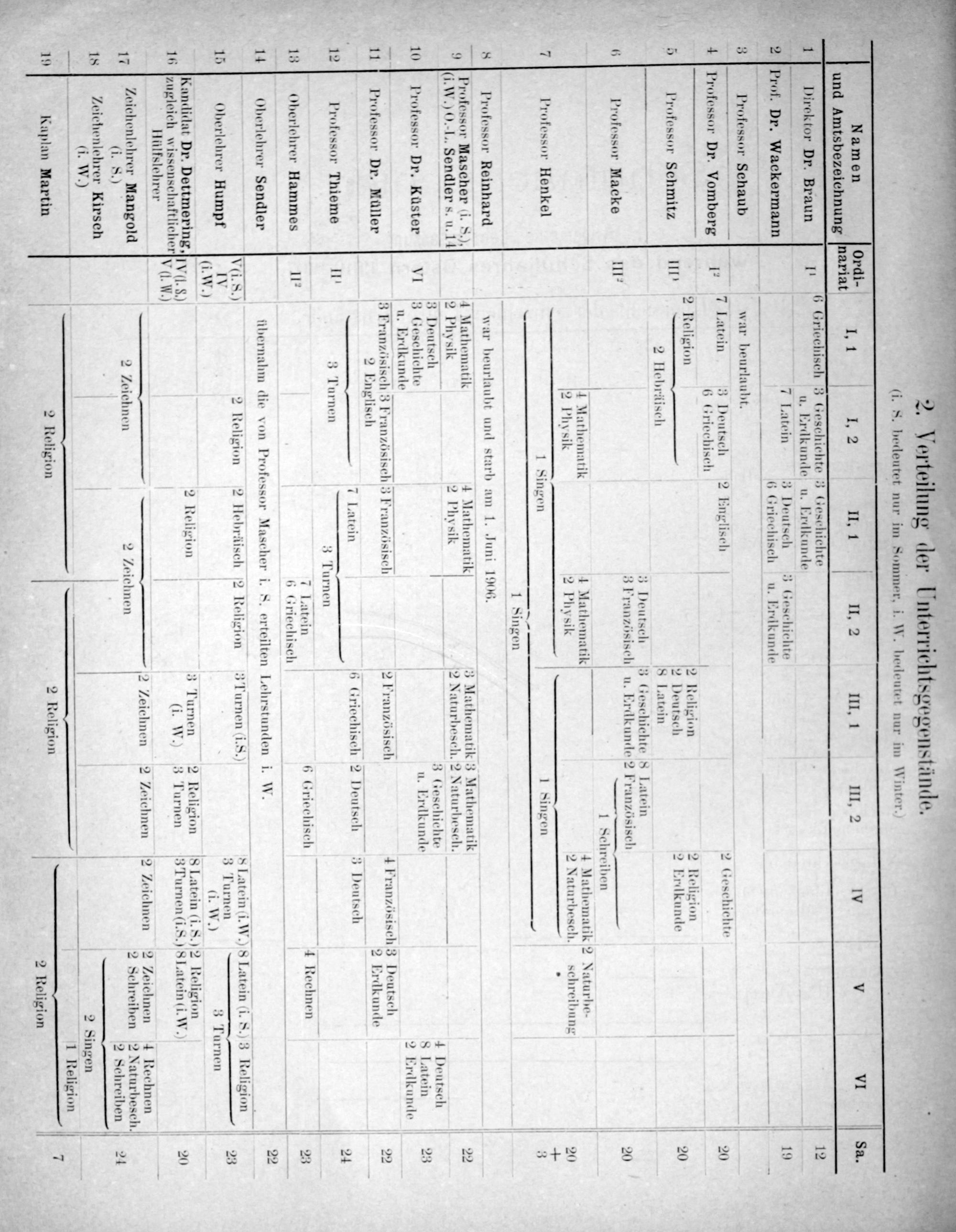 8. er Unterrichtsgegenstände. (i. S. bedeutet nur im Sommer, i. W. bedeutet nur im Winter.) Namen ordi- 1. 1 I. 2 II. 1 II, 2 III, 1 III, IV V VI und Amtsbezeiehnung nariat 3.. 4 6 Dricciisch 3 Geschichte 3 Geschichte 1 5 Direktor Dr. Braun. u. Erdkunde u. Erdkunde 12 7 Latein 3 Deutsch Geschichte G 3 Praf. Pr. w Waekerman—.—— 6 Griechisch u. Erdkunde 19 Professor Schaub war beurlaubt. B, Iatein 3 Deutsch 2 Hnglisch 2 Geschichte 9.fassor. 2 2 2 3 L'rofessor Dr. Vomberg1 6 Griechisch 5 20 2 Religion 2 Religion 2 Religion 5 P'rofessor Schmitz III' 2 Deutsch 2 Erdk 20 2 Ilebräisch Latein Geschichte 8 Latein 6 Professor Macke III“ u. Erdkunde 2 Französisch 20 2. 1 Schreiben 1 1 Mathematik 1 Mathematil 4 Mathematik 2 Natu 4 2 P'hysik 2 Physik 2 Naturbesch. schrei 20 3„ 28. 7 Profess Henkel 1 Singen 1 Singen' 4 1 1 Singen 1 8 P'rofessor Reinhard war beurlaubt am 1. Juni 1906. 9 Professor Mascher i. S.). 1 Mathematik 4 Mathematik 3 Mathematik 3 Mathematik 22 4 ſGi. W.) 0. 1.. sendler 8. 11 2 Physik 2 Physik 2 esch. 2 Naturbesch. 2 3 Deutsch 3 Geschichte 4 Deutsch 10 Professor Dr. Küster VI 3 Geschichte Erdkunde 8 Latein 23 „ u. Erdkunde 2 Erdkunde . 3 Französisch 3 Französisch3 2 Pranz 4 Französisch 3 Deutsch 2 11 Professor Dr. Nüller 2 Engliseh 2 Erdkunde . 7 Latein 6 Griechisch 2 Deutsch 3 PDeutsch 3 12 l'rofessor Thieme 11 3 Tuarnen— 24 3 Turnen 13 Oberlehrer Hammes 11“ 7 Latein 6 Griechiscrch— 1 RKechnen 23 . 6 Griechisch 2.— 14 Oberlehrer Sendler übernahm die von Professor Mascher i. S. erteilten i. W. 22 3 VGi. S.) 2 Hlebräisch 2 Religion nen(i. J.) SLatein i. W. S Latein(i. S. 3 Re ligion 1 15 Oberlehrer Humpf 1V Turnen—— 23 (i. W.(i. W.) 3 Turnen Kundidat Dr. Dettmering, VA 8.) 2 on 3 Turnen 2 8 Latein(i. S.) 2 Religion 16 ſzugleich wissenschaftlicher VG W.)(i. W.) 3 3 Turnen(i. S.) SLatein(i. W.) 20 3 Hlülfslehrer n. oihanlehrer zZeichnen 2 Zeichnen 2 Zeichnen 2 Zeichnen 4 Rechnen 17 zeiehe nlohrdr Mangold 2 Zeichnen 2 Zeichnen 1 2 Schreiben 2 Naturbesch 3 1. S. 2 Schreiben 24 18 Zeichenlehrer Kirsch (i. W.) 2 Singen ——— 1 Religion 19 Kaplan Martin 2 Religion 2 Religion——— 7 2 Religion