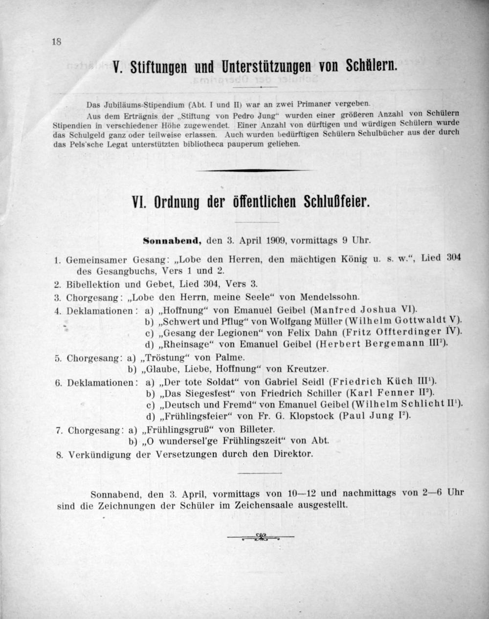 4. Deklamationen: a)„Hoffnung“ von Emanuel Geibel(Manfred Joshua VI). — b)„Schwert und Pflug“ von Wolfgang Müller(Wilhelm Gottwaldt V). c)„Gesang der Legionen“ von Felix Dahn(Fritz Offterdinger IV). d)„Rheinsage“ von Emanuel Geibel(Herbert Bergemann III). 5. Chorgesang: a)„Tröstung“ von Palme. b)„Glaube, Liebe, Hoffnung“ von Kreutzer. 6. Deklamationen: a)„Der tote Soldat“ von Gabriel Seidl(Friedrich Küch III). b)„Das Siegesfest“ von Friedrich Schiller(Karl Fenner II). c)„Deutsch und Fremd“ von Emanuel Geibel(Wilhelm Schlicht II!). d)„Frühlingsfeier“ von Fr. G. Klopstock(Paul Jung 1). 7. Chorgesang: a)„Frühlingsgruß“ von Billeter. b)„O wundersel'ge Frühlingszeit“ von Abt. 8. Verkündigung der Versetzungen durch den Direktor.