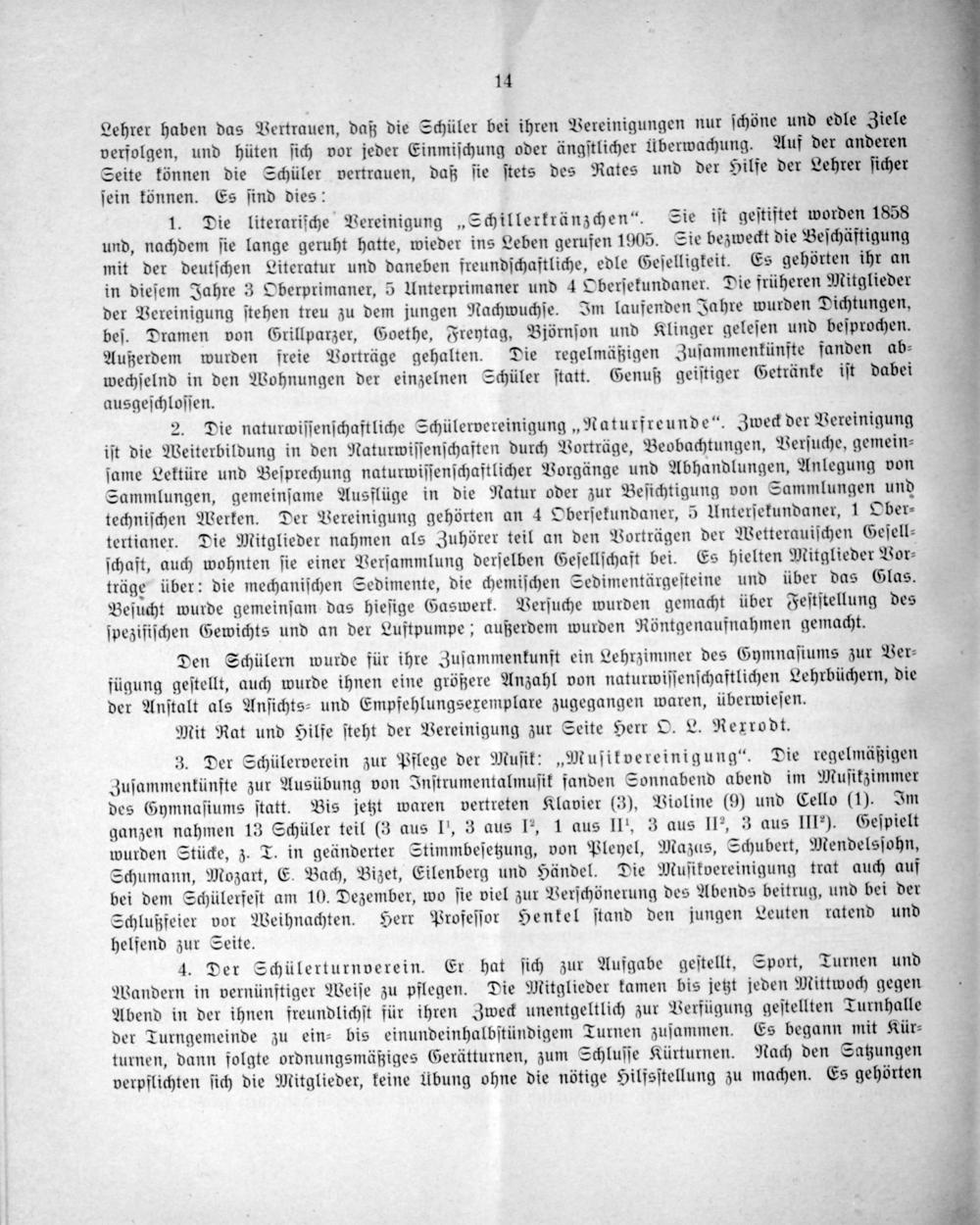 1. Die literariſche Vereinigung„Schillerkränzchen“. Sie iſt geſtiftet worden 1858 und, nachdem ſie lange geruht hatte, wieder ins Leben gerufen 1905. Sie bezweckt die Beſchäftigung mit der deutſchen Literatur und daneben freundſchaftliche, edle Geſelligkeit. Es gehörten ihr an in dieſem Jahre 3 Oberprimaner, 5 Unterprimaner und 4 Oberſekundaner. Die früheren Mitglieder der Vereinigung ſtehen treu zu dem jungen Nachwuchſe. Im laufenden Jahre wurden Dichtungen, beſ. Dramen von Grillparzer, Goethe, Freytag, Björnſon und Klinger geleſen und beſprochen. Außerdem wurden freie Vorträge gehalten. Die regelmäßigen Zuſammenkünfte fanden ab⸗ wechſelnd in den Wohnungen der einzelnen Schüler ſtatt. Genuß geiſtiger Getränke iſt dabei ausgeſchloſſen.