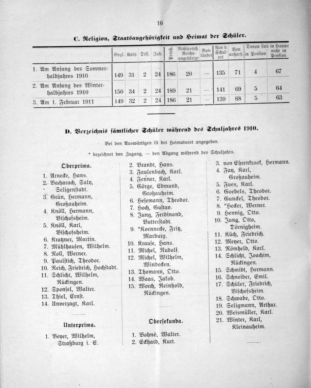 D. Verzeichnis ſämtlicher Schüler während des Schuljahres 1910.