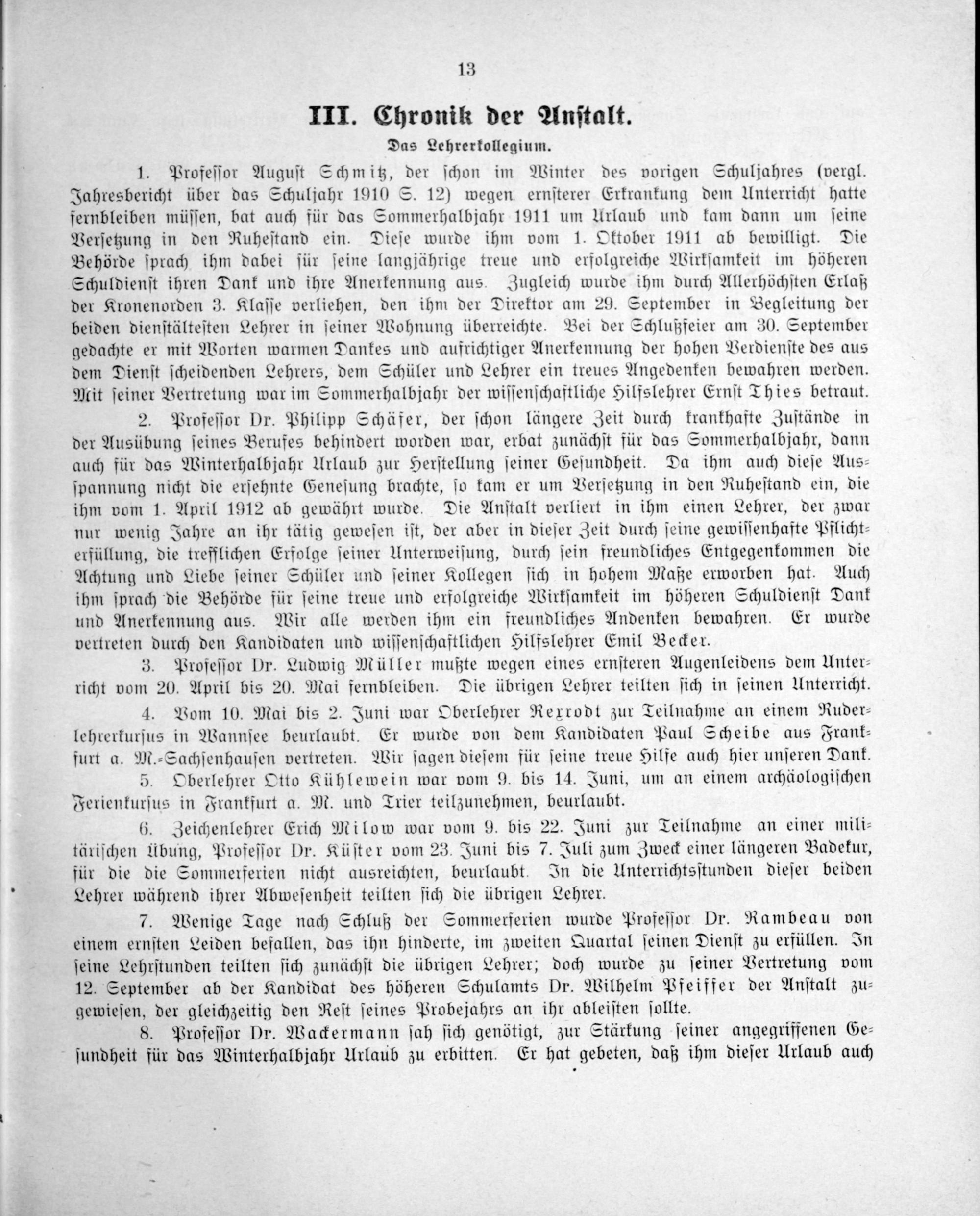 2. Profeſſor Dr. Philipp Schäfer, der ſchon längere Zeit durch krankhafte Zuſtände in der Ausübung ſeines Berufes behindert worden war, erbat zunächſt für das Sommerhalbjahr, dann auch für das Winterhalbjahr Urlaub zur Herſtellung ſeiner Geſundheit. Da ihm auch dieſe Aus⸗ ſpannung nicht die erſehnte Geneſung brachte, ſo kam er um Verſetzung in den Ruheſtand ein, die ihm vom 1. April 1912 ab gewährt wurde. Die Anſtalt verliert in ihm einen Lehrer, der zwar nur wenig Jahre an ihr tätig geweſen iſt, der aber in dieſer Zeit durch ſeine gewiſſenhafte Pflicht⸗ erfüllung, die trefflichen Erfolge ſeiner Unterweiſung, durch ſein freundliches Entgegenkommen die Achtung und Liebe ſeiner Schüler und ſeiner Kollegen ſich in hohem Maße erworben hat. Auch ihm ſprach die Behörde für ſeine treue und erfolgreiche Wirkſamkeit im höheren Schuldienſt Dank und Anerkennung aus. Wir alle werden ihm ein freundliches Andenken bewahren. Er wurde vertreten durch den Kandidaten und wiſſenſchaftlichen Hilfslehrer Emil Becker.