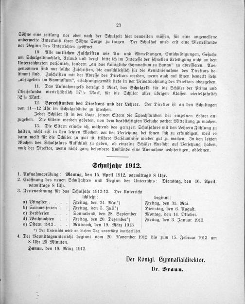 10 Alle amtlichen Zuſchriften wie An⸗- und Abmeldungen, Entſchuldigungen, Geſuche um Schulgeldnachlaß, Urlaub und dergl. bitte ich im Intereſſe der ſchnellen Erledigung nicht an den Unterzeichneten perſönlich, ſondern„an das Königliche Gymnaſium zu Hanau“ zu adreſſieren. Aus⸗ genommen ſind nur ſolche Zuſchriften, die ausſchließlich für die Kenntnisnahme des Direktors be⸗ ſtimmt ſind. Zuſchriften mit der Adreſſe des Direktors werden, wenn auch auf ihnen bemerkt ſteht „abzugeben im Gymnaſium“, erfahrungsgemäß ſtets in der Privatwohnung des Direktors abgegeben.