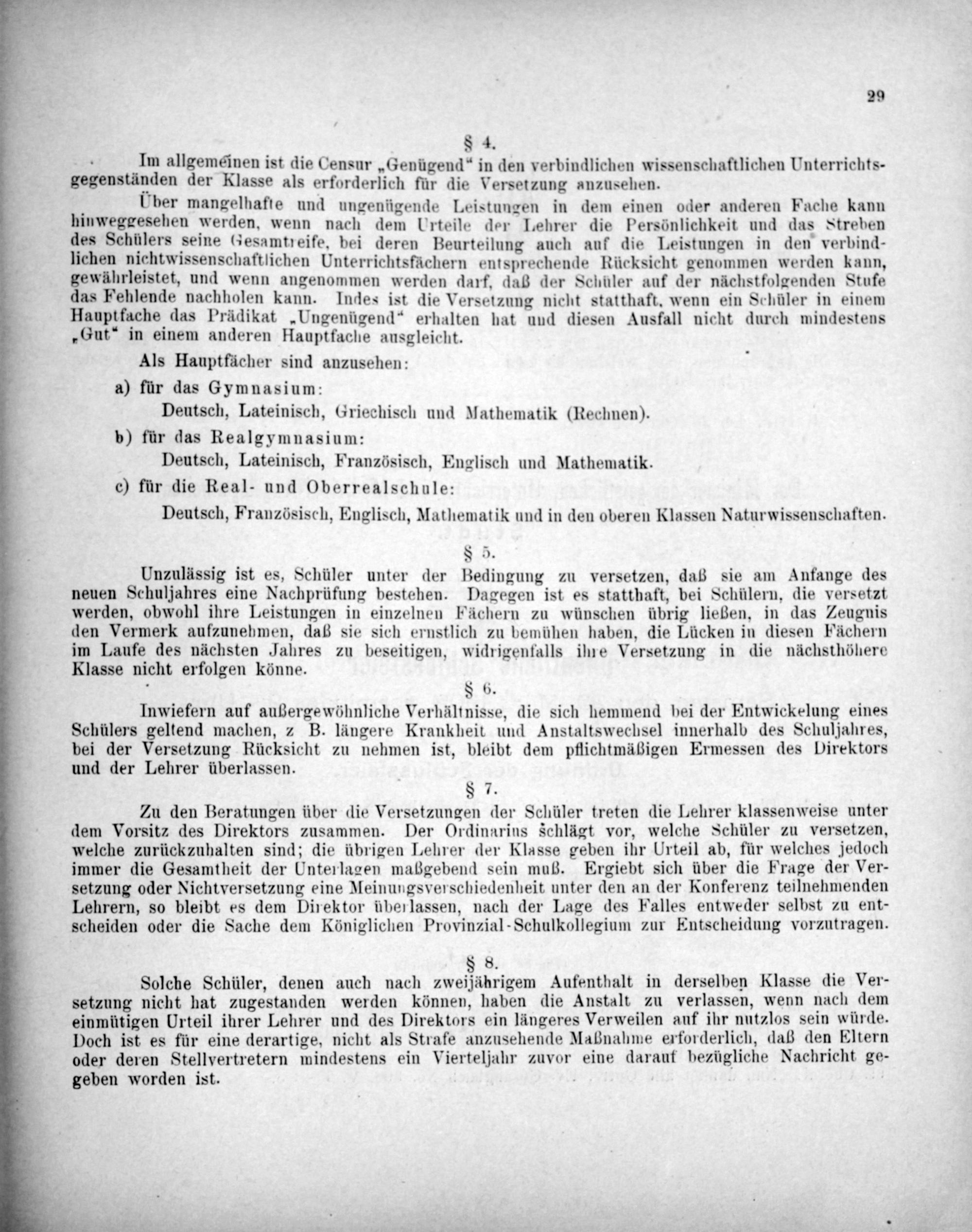 Als Hauptfächer sind anzusehen: a) für das Gymnasium: Deutsch, Lateinisch, Griechisch und Mathematik(Rechnen). b) für das Realgymnasium: Deutsch, Lateinisch, Französisch, Englisch und Mathematik. c) für die Real- und Oberrealschule: Deutsch, Französisch, Englisch, Mathematik und in den oberen Klassen Naturwissenschaften.