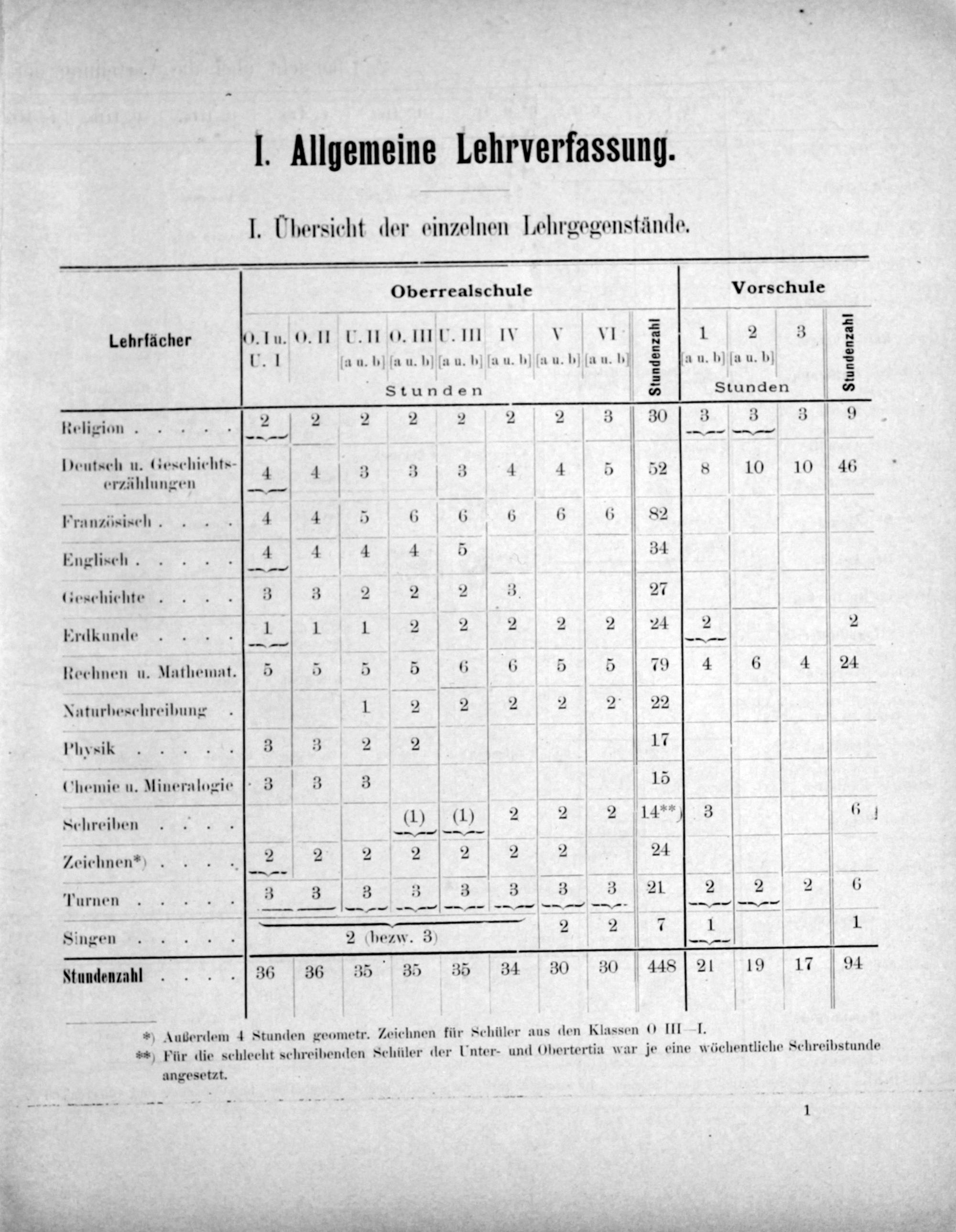 Oberrealschule Vorschule Lehriicher N0. 1u. 0. 11 U. O. inr. m I VV1 2 3 „ U. 1 a u. b' ſa u. b ſa u. b la u. b ſa u. bi[a u. b 5 a u. b) ſa u. b 2 8 5 Stunden Stunden Religion. 2 2 2 2 2 2 2 3 30 3 3 3 9 Deutsch u. Geschichts-. 9.—— erzühlungen 4 4* 3* 4 1 2 52 8 10 10 46 Französisch. 4 1 5 6 6 6 6 6 82 Englisch. 14 4 4 4 3 34 Geschichte 3 3 2 2 2 3 27 Erdkunde 1 1 1 2 2 2 2 2 24 2 2 ———— Rechnen u. Mathemnt.] 5 5 5 5 6 6 5 5 79 4 6 4 24 Nuturbeschreibung 1 2 2 2 2 2 22 P'hysik 383 3 2 2 17 Chemie u. Mineralogie † 3 3 3 15 V Schreiben(1)(1) 2 2 2 14* 3 6] ———— Zeichnen*) 2 2 2 2 2 2 2 24 V —— Turnen 3 3 V 3 3 3 3 3 3 21 2 2 2 6 ———,————————————,——— — V V Singen 2(bezw. 3 2 2 1 1. ¹ Ftundenzahl 36 36 35 35 35 34 30 30 448 21 19 17 94