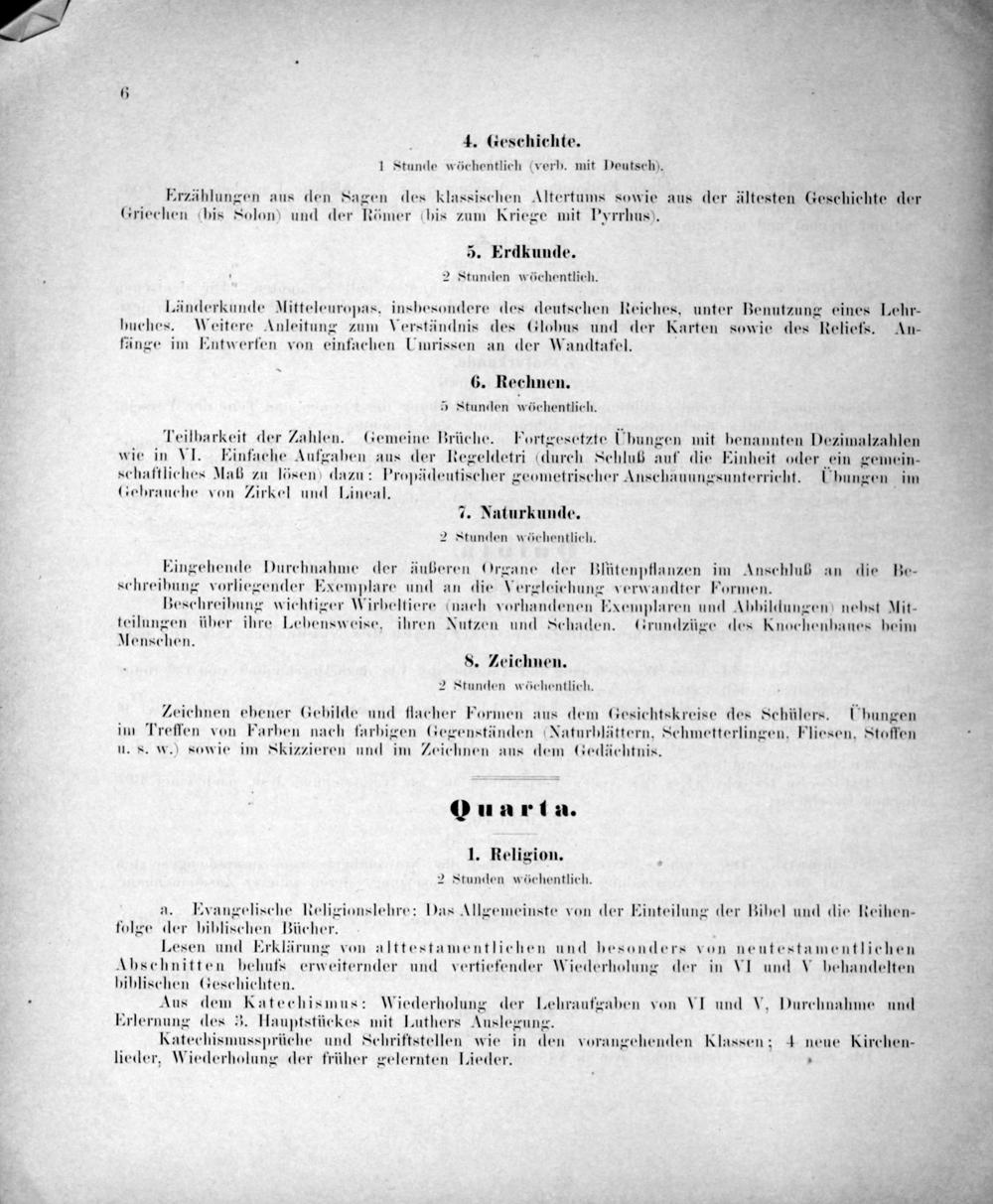Länderkunde Mitteleuropas, insbesondere des deutschen Reiches, unter Benutzung eines Lehr- buches. Weitere Anleitung zum Verständnis des Globus und der Karten sowie des Reliefs. An- fänge im Entwerfen von einfachen Umrissen an der Wandtafel.