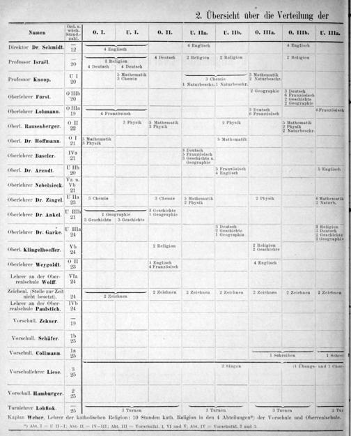 far E o 1 Namen Sndch. 0. 1. U. I. 0. II. U. IIa. L. IIb. 0. IIIa. V 0. IIIb. U. zahl. 4—— 2 is 4 i Direktor Dr. Schmidt. 4 Eneljeeh nweuheh —— 4 Deutsch 2 Religion 2 Religion 2 Religion Professor Israël. 20 2 Religion — 4 Deutsch 4 Deutsch —.————— 1 8: 5 Mathematik 5 Mathematik Professor Knoop. 20 3 Chemie 3 Chemie 2 Naturbesehr. 1 Naturbeschr. 1 Naturbesehr. — 0 IIIb 5—— 2 Geographie 3 Deutsch— Oberlehrer Forst. 20 3 Praeeneen — 2 Geographie 1 0 IIIa— 3 Deutsch 6Französiseh Oberlehrer Lohmann. 19 4 Französisch 6 Französisch 2en 0 II 3 Physik 5 Mathematik 2 Physik 5 Mathematik.. Oberl. Rausenberger. 22 3 Physik 2 Physik 2 Naturbeschr. 1 d I. Nathemattt 5 Mathematik ͤͤ Oberl. Dr. Hoffmann. 21 5 V thematik à Matbematib wWa—— 3 Deutsch— ͤſͤ „ohra 1 5 Französisch 4 Oberlehrer Baseler. 21 3 Geschichte u. 3 4—Qꝑꝑqꝑqꝑ———. Geographie— . U IIb 5 Französisch 5 Englisch Oberl. Dr. Arendt. 20 4 Engliseh 6 1 — 4 Va u 5— öͤͤͤͤ— Oberlehrer Nebelsieck. Vb 21 8 . 2., U Ila 3 Chemie 4 3 Chemie 5 Mathematik 2 Physik 6 Mathematik Oberlehrer Dr. Zingel. 23 2 Physik 8 2 Naturb. U IIIb 3 Geschichte* Oberlehrer Dr. Ankel. 21 1 Geographie 1 Geographie 21 deschiehte 3 Geschichte 4 4 3. U IIIa— 4——* 3 Deutoeh 2 Relgldn* erlehrer ark 1 2 Geschichte 3 Deutsch Oberlehrer Dr. Garke. 24 k Geourahhbe 2 Geschiehte —————·.—2 Geographie ) 2 Religion 2 Religion Oberl. Klingelhoeffer. 2 Geschichte 24 0 II 1 Englisch 4 Englisch— Oberlehrer Weygoldt. 23 4 Französisch Lehrer an der Ober- VIa realschule Wolff. 24 Zeichenl.(Stelle zur Zeit—— 2 Zeichnen 2 Zeichnen 2 Zeichnen 2 Zeichnen 2 Zeiehnen 2 Zeichnen nicht besetzt). 24 2 Zeichnen Lehrer an der Ober- IVb realschule Paulstich. 24 6 — Vorschull. Zehner. 19 4* Vorschull. Schäfer. 1* ——————— Vorschull. Collmann. 4 1 Schreiben „.— 3 2 Singen(1 Ubungs- und 1 G9s Vorschullehrer Liese. 25 4 Vorschull. Hamburger./ V Purnlehrer Lohfink. 25 3 Turnen 3 Turnen 3 Turnen V 3