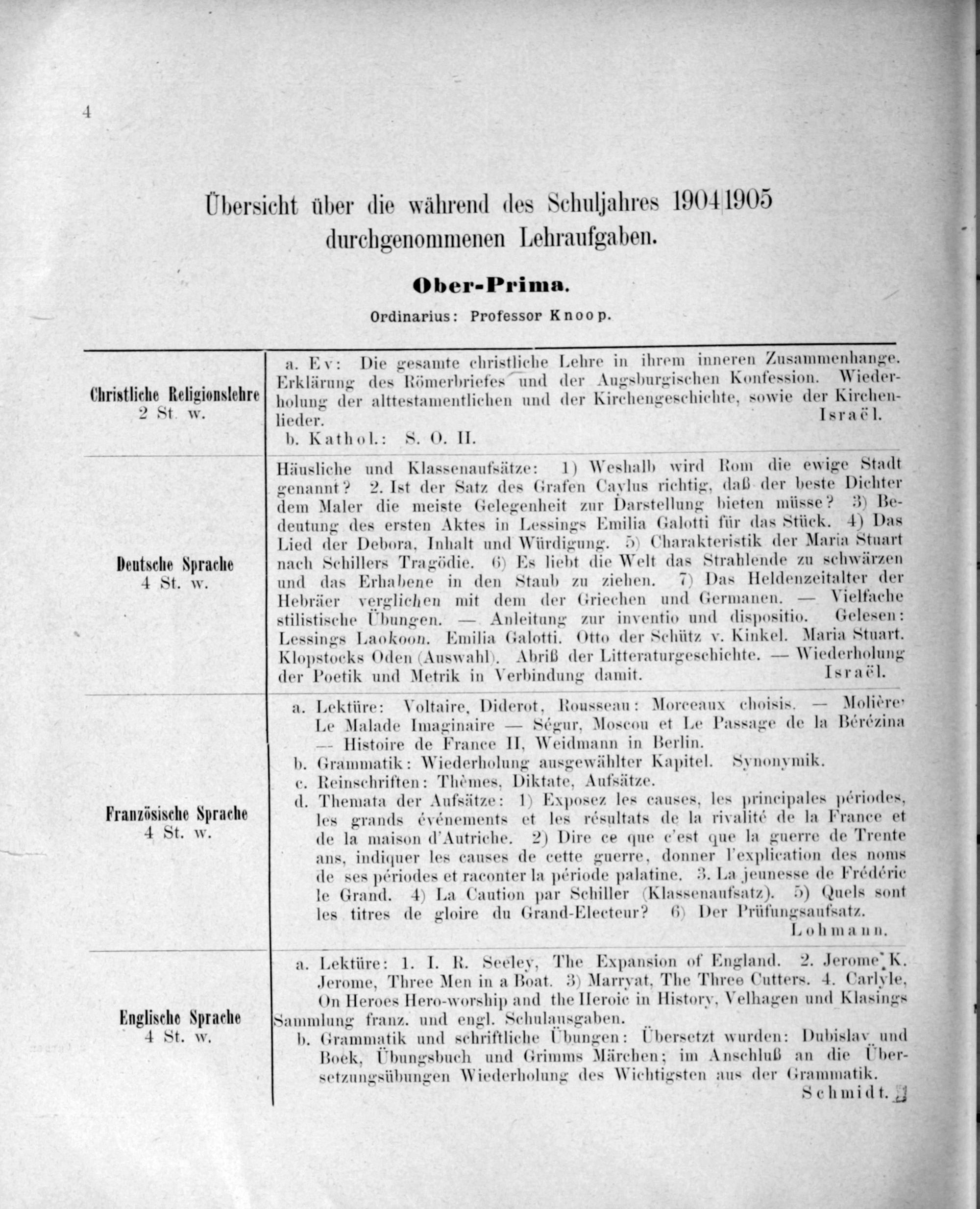 Hebräer verglichen mit dem der Griechen und Germanen.— Vielfache stilistische Ubungen.— Anleitung zur inventio und dispositio. Gelesen: Lessings Laokoon. Emilia Galotti. Otto der Schütz v. Kinkel. Maria Stuart. Klopstoc ks Oden(Auswahl). Abriß der Litteraturgeschichte.— Wiederholung