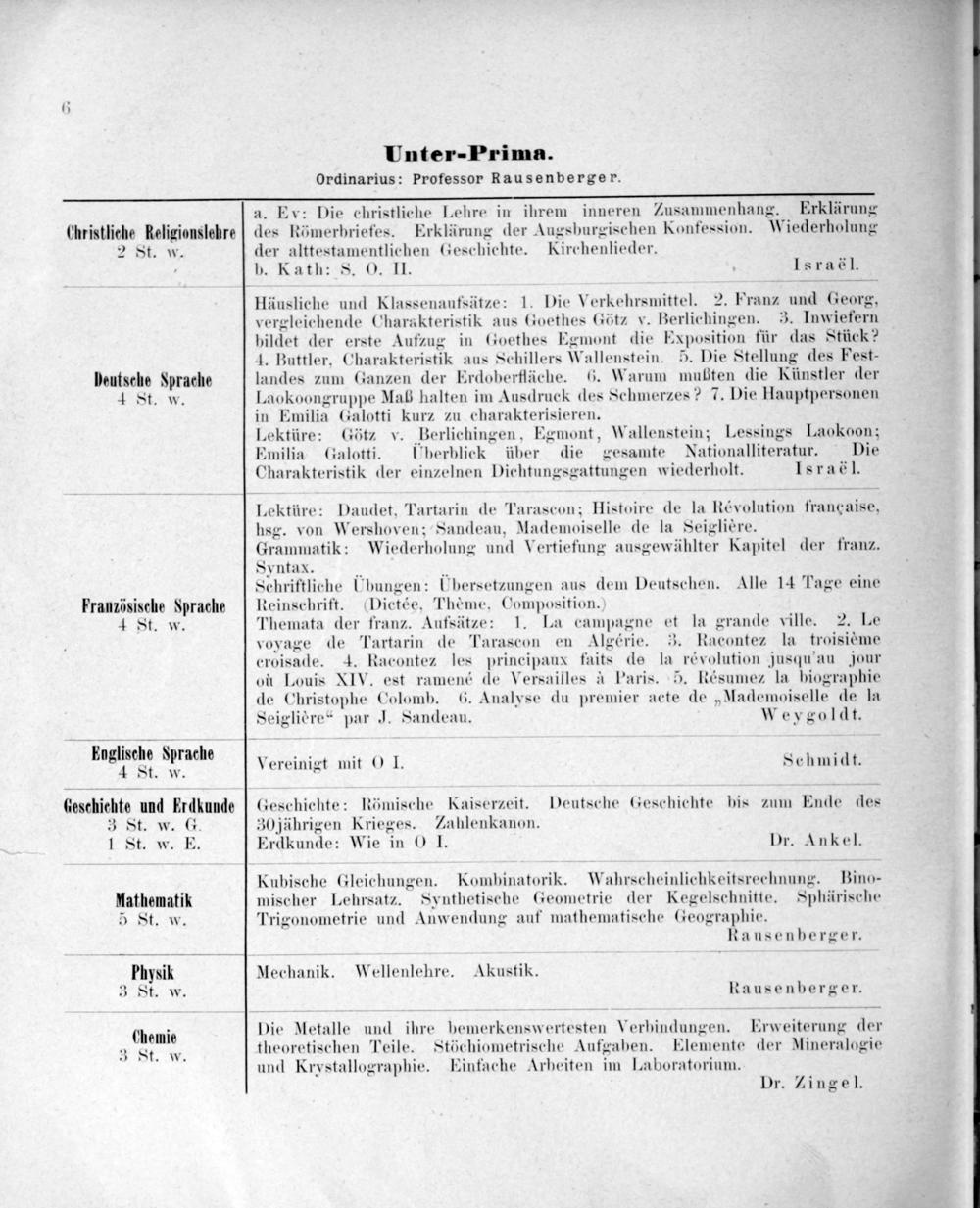 Trigonometrie und Anwendung auf mathematische Geographie. Rausenberger. Mechanik. Wellenlehre. Akustik. Rausenberger. Die Metalle und ihre bemerkenswertesten Verbindungen. Erweiterung der theoretischen Teile. Stöchiometrische Aufgaben. Elemente der Mineralogie und Krystallographie. Einfache Arbeiten im Laboratorium. Dr. Zingel.