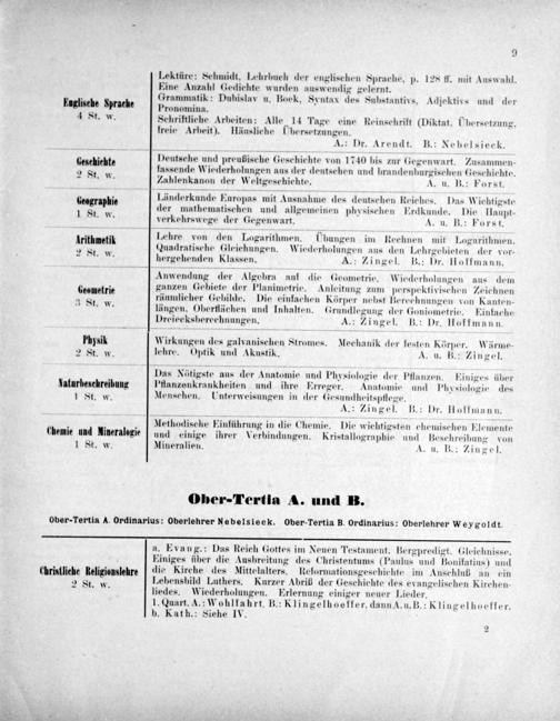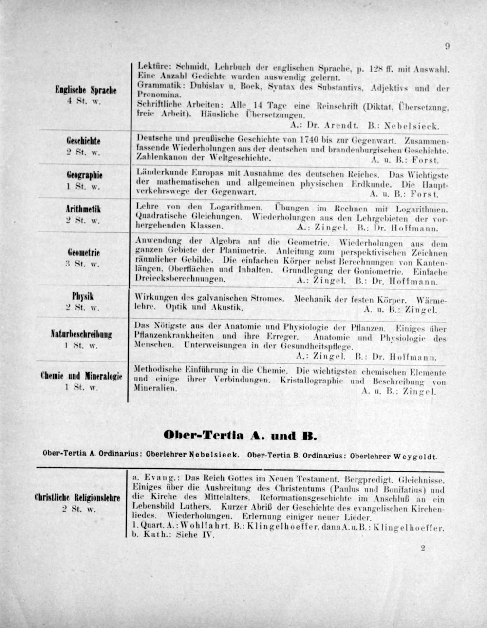 Ober-Tertia A. Ordinarius: Oberlehrer Nebelsieck. Ober-Tertia B. Ordinarius: Oberlehrer Weygoldt.