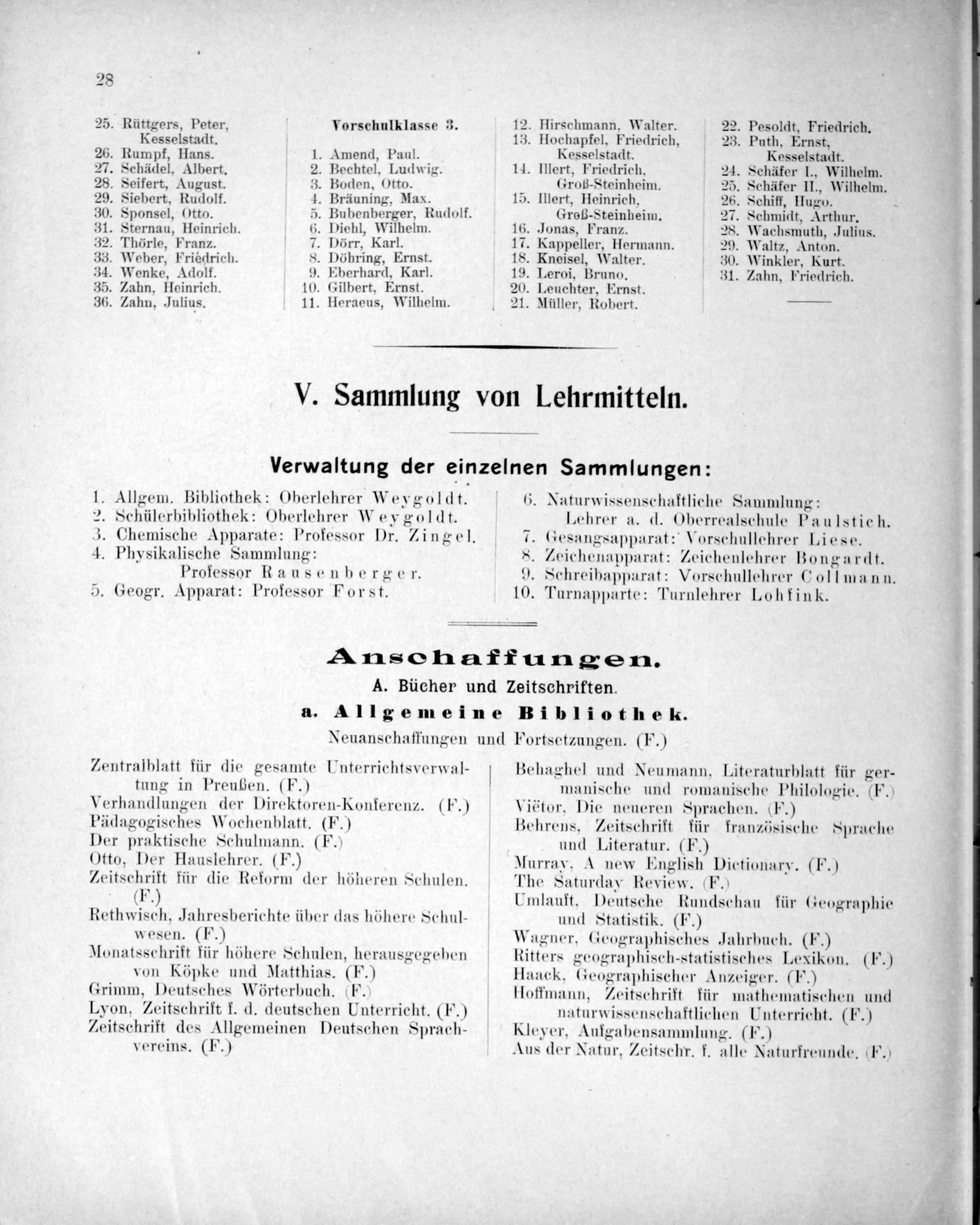 1. Allgem. Bibliothek: Oberlehrer Weygoldt. 2. Schülerbibliothek: Oberlehrer Weygoldt. 3. Chemische Apparate: Professor Dr. Zingel. 4. Physikalische Sammlung: