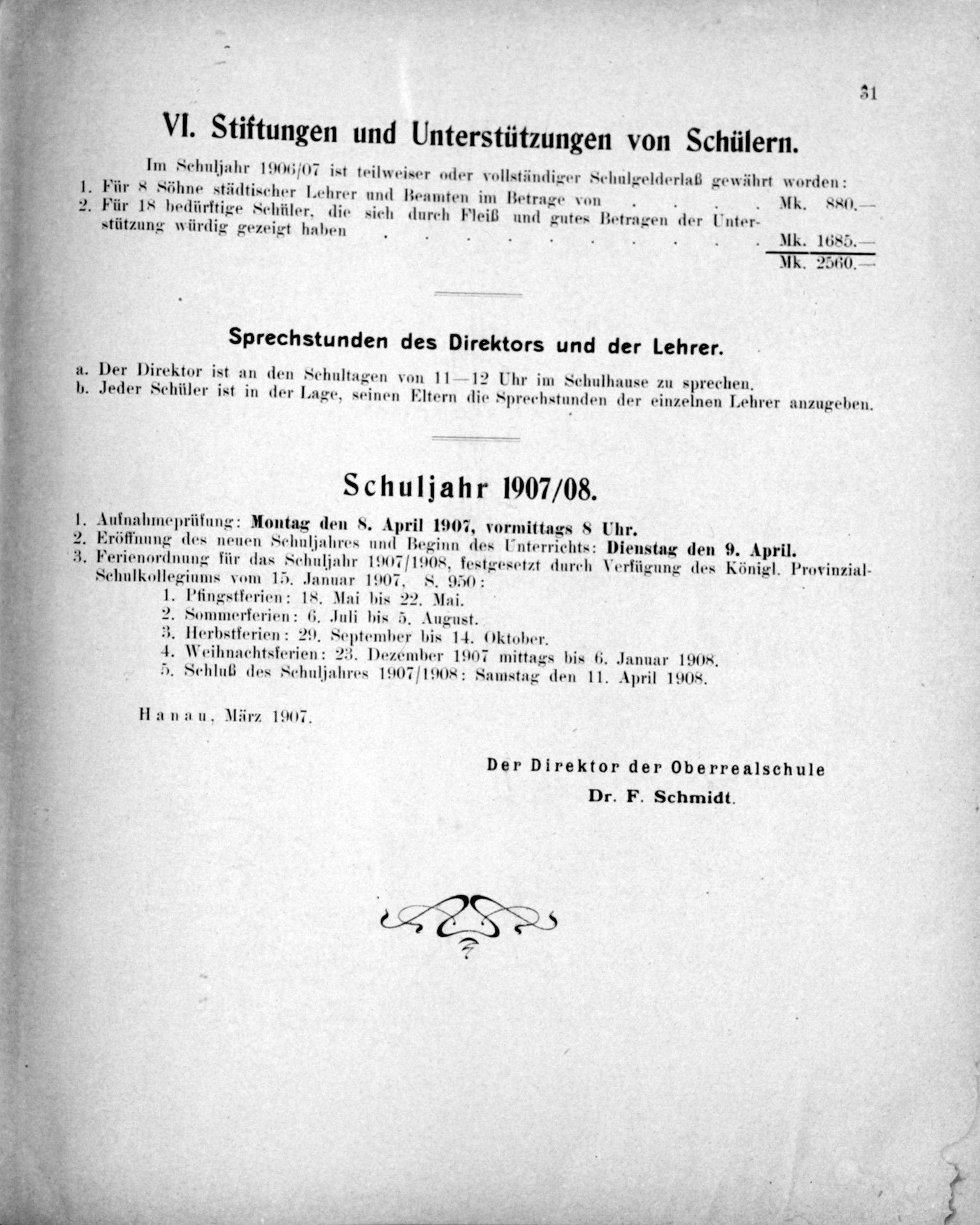 5. Schluß des Schuljahres 1907/1908: Samstag den 11. April 1908.