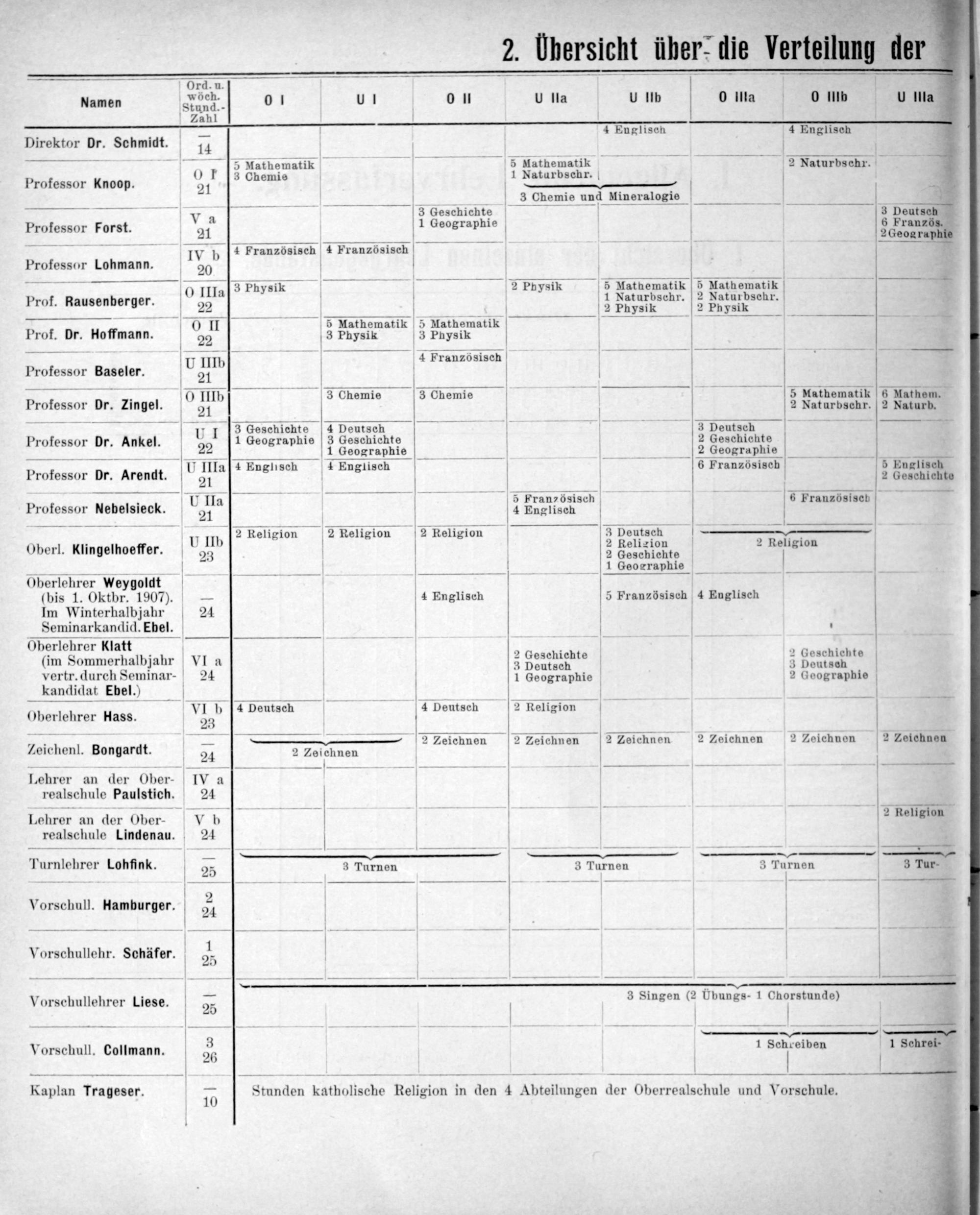Ord. u. Namen Seunn. 01 u 0 II U lla u b 4 0 IHla 0 uIlb u la Zahl— — 4— 4 Englisch 4 Englisch 4 Direktor Dr. Schmidt. 14 1 5 Mathematik— 5 Mathematik 2 Naturbschr. 4 Professor Knoop. 01 5 Chemi⸗ 11 Mtarbachr.— 6— 3 Chemie und 1 Mineralogie—ʒꝛʒmʒʒ⅓,— 2 8—— V a— 3 Geschichte 3 Deutsch Professor Forst. 21 1 Geographie SErans IVn 7 Französisch 4 Französisch Professor Lohmann IVY b 5 20 —— 0 IIIa3 Physik physik— 5 NMatnematik 5 Mathematik ſſͤ Prof. Rausenberger. 22 4 41 Berurhshr. 2 Vtufbsobr⸗ „ 6 II 5 Mathematik 5 Mathematik. S 8 Prof. Dr. Hoffmann. t 3 Physik 3 Physik Französisch—- Professor Baseler. 1- I I V — dmib— 3 Ohemie 3 Chemie 1 eeeezathematik Mathem. Professor Dr. amger 41.— 2 Naturbschr. 2 Naturb. Prof dr Ankel uI— 1bereh 8 2 3 Pentche Professor Dr. Ankel. leographie eschichte 2 Geschichte 22 1 Geographie 2 Geographie 4 Englisch 41 Englisch 8 Französisch 5 Englisch Profossor Dr. Arendt. 0 MIi vs e vglls V 2 Geschichte — 22————— ] 5 5 Frau sisch 6 Französisch Professor Nebelsieck. um 4 Englisch ————.——————— U In 2 Religion 2 Religion 2 Religion 3 Deutsch— Oberl. Klingelhoeffer. 2 2 Beliziont. 2 Religlon ————— 1 Seosreriie— Oberlehrer Weygolct (bis 1. Oktbr. 1907).— 4 Englisch 5 Französisch 4 Englisch Im Winterhalbjahr 24 Seminarkandid. Ebel. 1 Oberlehrer Klatt 2 2 6 4 (im Sommerhalbjahr VI a 2 Lorohiehte 4 Gereniente vertr. durch Seminar- 24 1 Geographie 2 Geographie kandidat t Ebel.) I.————— 7 4 Deutsch 2 Religi Oberlehrer lass. Llr 4 Deutsch eutsc V eligion V 2,—— 2 Zeichnen 2 Zeichnen 2 Zeichnen 2 Zeichnen 2 Zeichnen 2 Zeichnen Zeichenl. Bongardt. 24 2 Zeichnen ———-———————-— Lehrer an der Ober- IV a realschule Paulstich. 24 Lehrer an der Ober. V b 2 Religion realschule Lindenau. 24. . aete im———— Turnlehrer Lohfink. 25 3 Turnen 3 Turnen 3 Turnen 3 Tur. w————— — c Vorschull. Hamburger. 2 ö Vorschullehr. Schäfer. 44 ¹ ————————————— Vorschullehrer Liese. 25 3 Singen(2 Ubungs- 1 Chorstunde) 5 Vorschull. Colmann. 3 1 Sehceiben 1 Sa Kaplan Trageser. 10 Stunden katholische Religion i in den 4 Abteilungen der Oberroalschule und Vorschule.