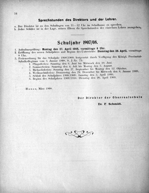 4. Weihnachtsferien: Donnerstag den 24. Dezember bis Mittwoch den 6. Januar 1909. 5. Schluß des Schuljahres 1908/1909: Samstag den 3. April 1909. z. Beginn des Schuljahres 1909/1910: Dienstag den 20. April 1909.