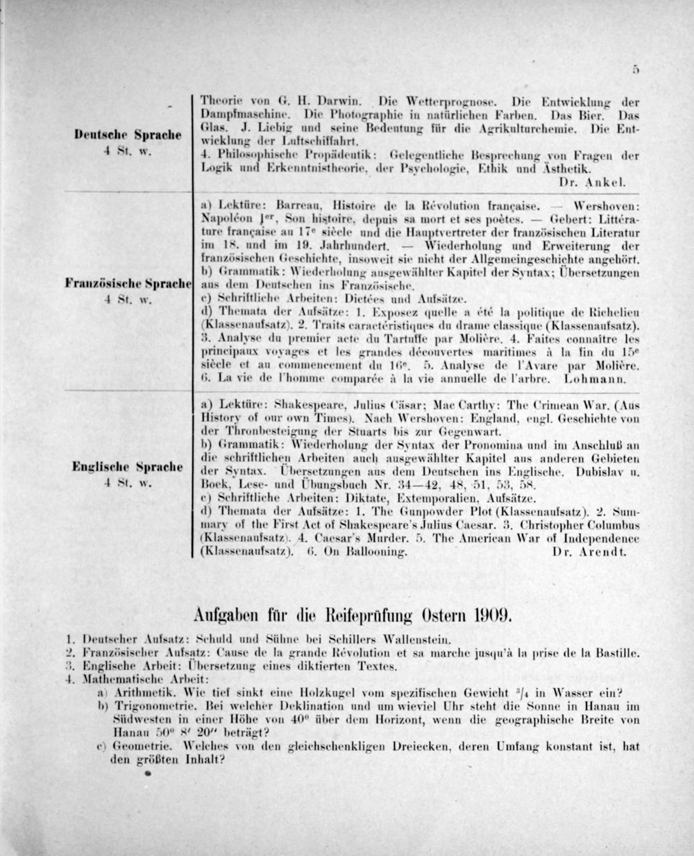 1. Deutscher Aufsatz: Schuld und Sühne bei Schillers Wallenstein. 2. Französischer Aufsatz: Cause de la grande Révolution et sa marche jusqu'à la prise de la Bastille. 3. Englische Arbeit: Ubersetzung eines diktierten Textes. 4. Mathematische Arbeit: a) Arithmetik. Wie tief sinkt eine Holzkugel vom spezifischen Gewicht ¼ in Wasser ein? b) Trigonometrie. Bei welcher Deklination und um wieviel Uhr steht die Sonne in Hanau im Südwesten in einer Höhe von 40° über dem Horizont, wenn die geographische Breite von Hanau 50° 8 20“ heträgt? c) Geometrie. Welches von den gleichschenkligen Dreiecken, deren Umfang konstant ist, hat den größten Inhalt?