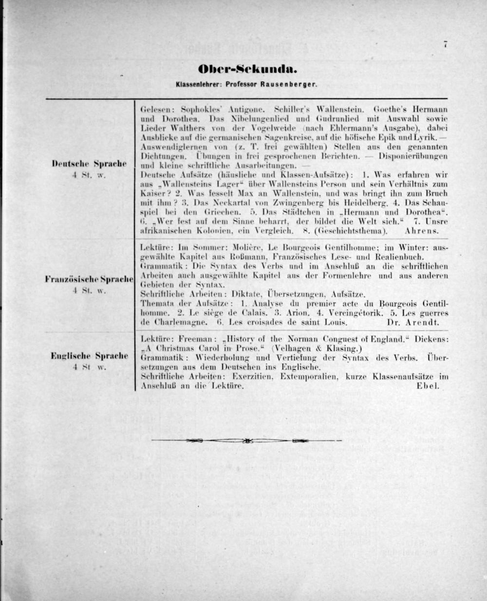 Deutsche Aufsätze(häusliche und Klassen-Aufsätze): 1. Was erfahren wir aus„Wallensteins Lager“ über Wallensteins Person und sein Verhältnis zum Kaiser? 2. Was fesselt Max an Wallenstein, und was bringt ihn zum Bruch mit ihm? 3. Das Neckartal von Zwingenberg bis Heidelberg. 4. Das Schau- spiel bei den Griechen. 5. Das Städtchen in„Hermann und Dorothea“. 6.„Wer fest auf dem Sinne beharrt, der bildet die Welt sich.“ 7. Unsre afrikanischen Kolonien, ein Vergleich. S.(Geschichtsthema). Ahrens.