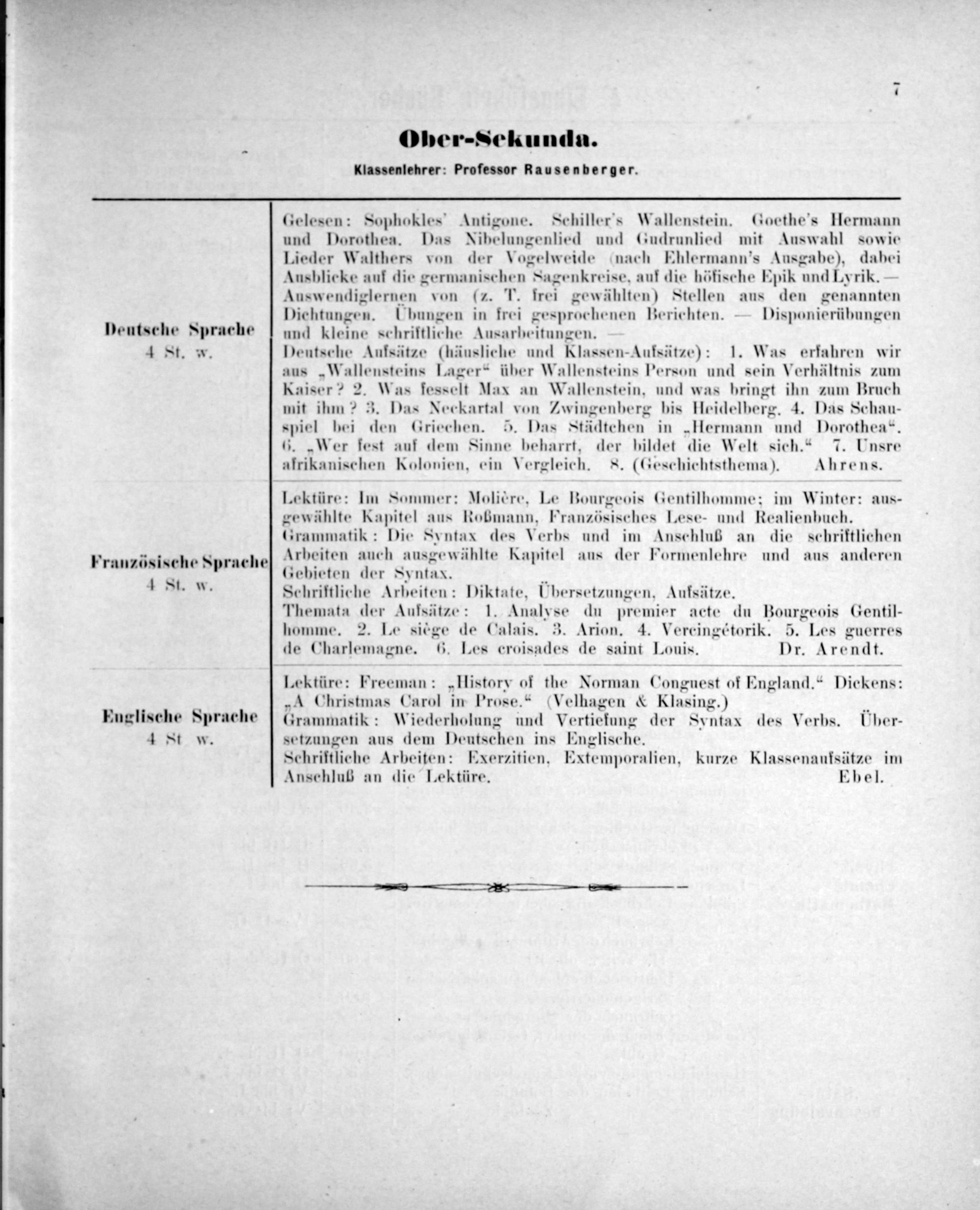 Gelesen: Sophokles Antigone. Schiller’s Wallenstein. Goethe’s Hermann und Dorothen. Das Nibelungenlied und Gudrunlied mit Auswahl sowie Lieder Walthers von der Vogelweide nach Ehlermann’s Ausgabe), dabei Ausblicke auf die germanischen Sagenkreise, auf die höfische Epik und Lyrik. Auswendiglernen von(z. T. frei gewählten) Stellen aus den genannten Dichtungen. U'bungen in frei gesprochenen Berichten. Disponierübungen und kleine schriftliche Ausarbeitungen.