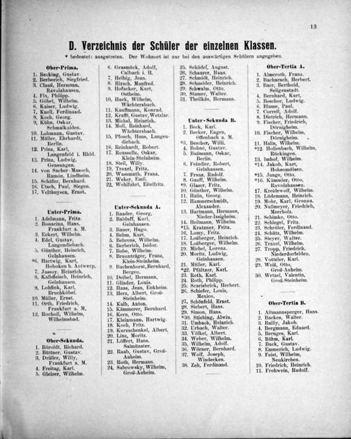 Ober-Prima. Becking, Gustay. Berberich, Siegfried. Claub, Hermann, Ravolzhausen. Fix, Philipp. Göbel, Wilhelm. Kaiser, Ludwig. Knell, Ferdinand. Koch, Georg. Kühn, Oskar, Schmalkalden. Lohmann, Gustav. Müller, Ehrhardt, Berlin. Prinz, Karl, Langenfeld i. Rhld.
