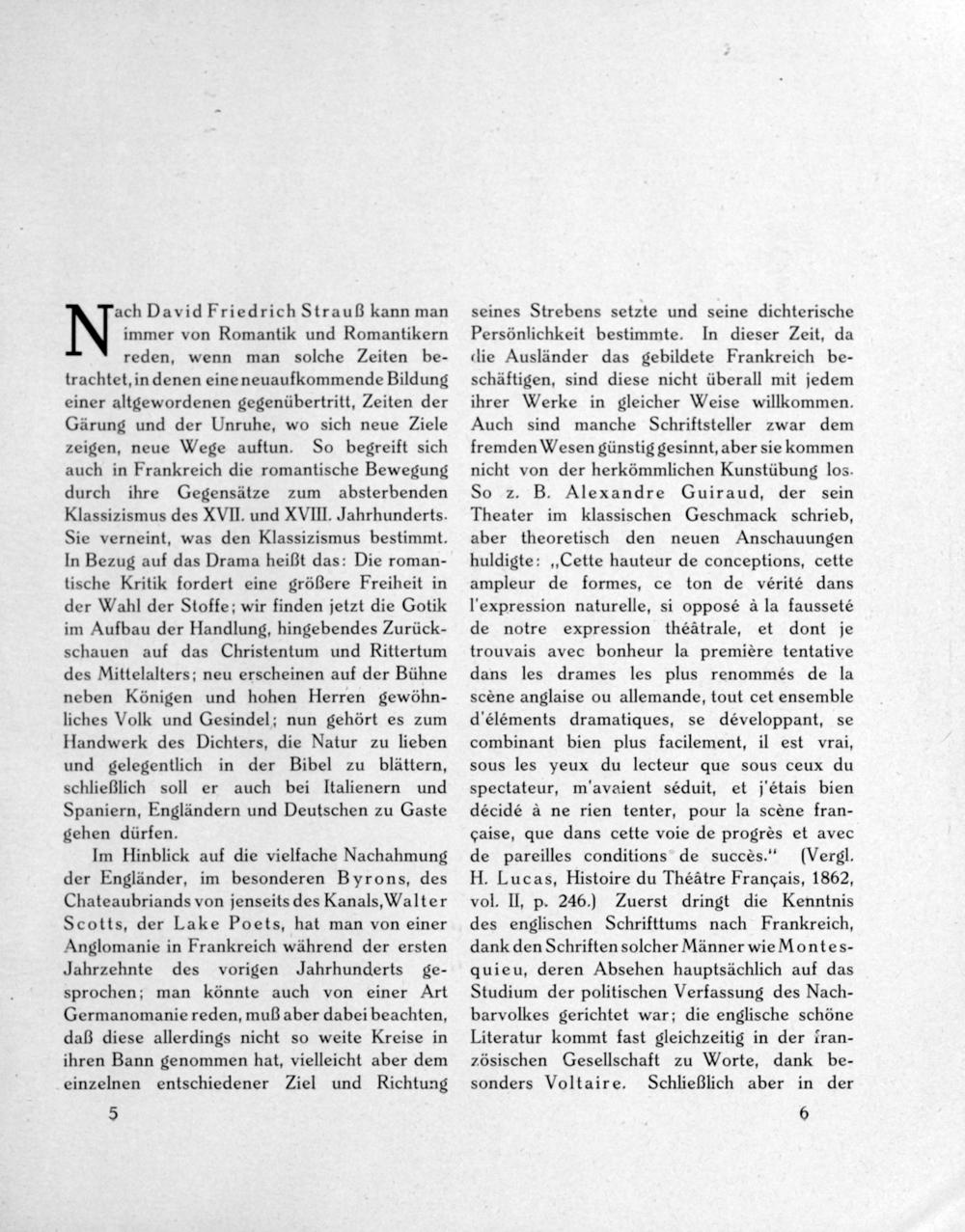 seines Strebens setzte und seine dichterische Persönlichkeit bestimmte. In dieser Zeit, da dlie Ausländer das gebildete Frankreich be- schäftigen, sind diese nicht überall mit jedem ihrer Werke in gleicher Weise willkommen. Auch sind manche Schriftsteller zwar dem fremden Wesen günstig gesinnt, aber sie kommen nicht von der herkömmlichen Kunstübung los. So z. B. Alexandre Guiraud, der sein Theater im klassischen Geschmack schrieb, aber theoretisch den neuen Anschauungen huldigte:„Cette hauteur de conceptions, cette ampleur de formes, ce ton de vérité dans l'expression naturelle, si opposé à la fausseté de notre expression théatrale, et dont je trouvais avec bonheur la premiere tentative dans les drames les plus renommés de la scene anglaise ou allemande, tout cet ensemble d'éléments dramatiques, se développant, se combinant bien plus facilement, il est vrai, sous les yeux du lecteur que sous ceux du spectateur, m'avaient séduit, et j'étais bien décidé à ne rien tenter, pour la scène fran- çaise, que dans cette voie de progrès et avec de pareilles conditions de succès.“(Vergl. H. Lucas, Histoire du Théatre Français, 1862, vol. II, p. 246.) Zuerst dringt die Kenntnis des englischen Schrifttums nach Frankreich, dank den Schriften solcher Männer wie Montes- quieu, deren Absehen hauptsächlich auf das Studium der politischen Verfassung des Nach- barvolkes gerichtet war; die englische schöne Literatur kommt fast gleichzeitig in der fran- zösischen Gesellschaft zu Worte, dank be- sonders Voltaire. Schließlich aber in der