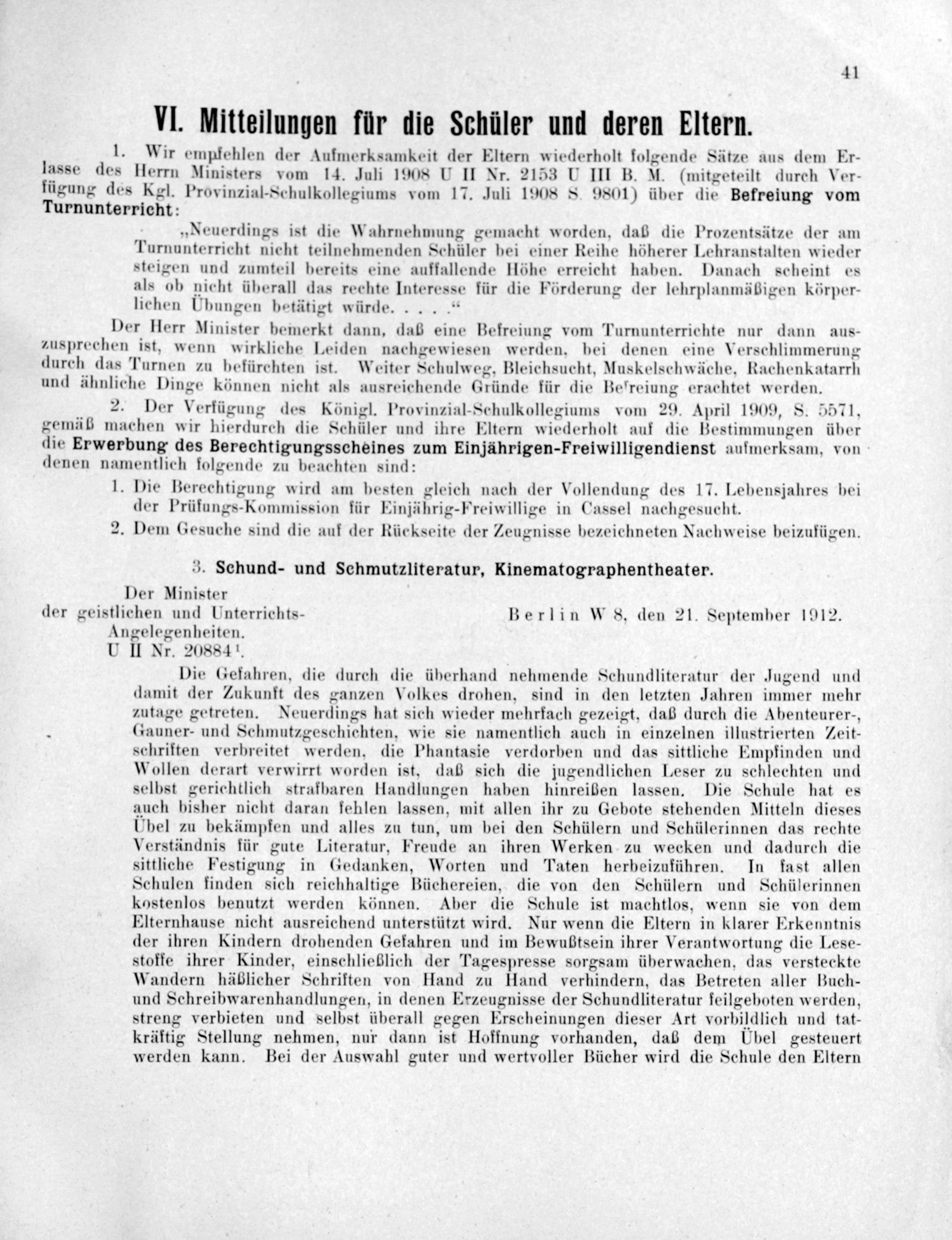 1. Wir empfehlen der Aufmerksamkeit der Eltern wiederholt folgende Sätze aus dem Er- lasse des Herrn Ministers vom 14. Juli 1908 U II Nr. 2153 U III B. M.(mitgeteilt durch Ver- fügung des Kgl. Provinzial-Schulkollegiums vom 17. Juli 1908 S 9801) über die Befreiung vom Turnunterricht: