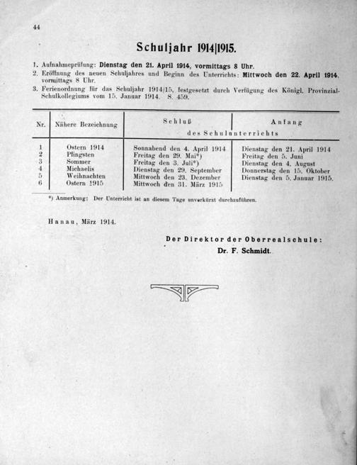 Eröffnung des neuen Schuljahres und Beginn des Unterrichts: Mittwoch den 22. April 1914.