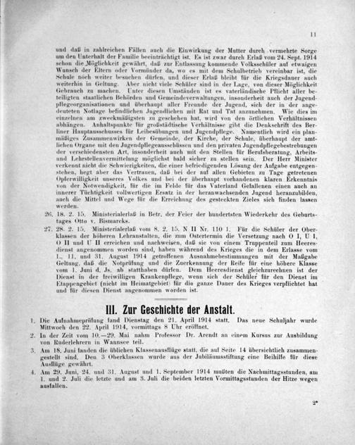 27. 28. 2. 15. Ministerialerlaß vom 8. 2. 15. N II Nr. 110 1. Für die Schüler der Ober- klassen der höheren Lehranstalten, die zum Ostertermin die Versetzung nach 0 I, U I, 0 II und UI II erreichen und nachweisen, daß sie von einem Truppenteil zum Heeres- dienst angenommen worden sind, haben während des Krieges die in dem Erlasse vom 1., 11. und 31. August 1914 getroffenen Ausnahmebestimmungen mit der Maßgabe Geltung, dab die Notprüfung und die Zuerkennung der Reife für eine höhere Klasse vom 1. Juni d. Js. ab statthaben dürfen. Dem Heeresdienst gleichzurechnen ist der Dienst in der freiwilligen Krankenpflege, wenn sich der Schüler für den Dienst im Etappengebiet(nicht im Heimatgebiet) für die ganze Dauer des Krieges verpflichtet hat und für diesen Dienst angenommen worden ist.