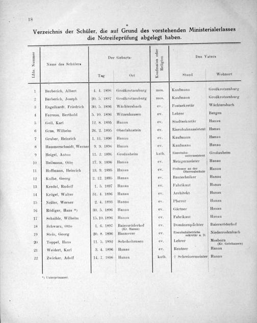 4 4 2 Der Geburts- 25 Des Vaters 2 Name des Schülers 5 S . 2 3 d 8 Tag Ort 2 Stand Wohnort 1 Berberich, Albert 1. 1. 1896 Grobßkrotzenburg mos. Kaufmann Großkrotzenburg 2 Berberich, Joseph 20. 5. 1897 Großkrotzenburg mos. Kaufmann Großkrotzenburg 3 Engelhardt, Friedrich 30. 5. 1896 Wächtersbach ev. Postsekretär Wächtersbach 1 Ferreau, Berthold 5. 10. 1896 Witzenhausen ev. Lehrer Bergen 5 Goll, Karl 12. 8. 1895 Hanau ev. Stadtsekretär Hanau 6 Gras, Wilhelm 26. 2. 1895 Oberlahnstein ev. Eisenbahnassistent Hanau 7 Gruber, Heinrich 1. 11. 1896 Hanau ev. Kaufmann Hanau 8 Hammerschmidt, Wernerf 9. 9. 1896 Hanau ev. Kaufmann Hanau 9 Heigel, Anton 11. 2. 1896 Großauheim kath. Eisenbahn 4 Großauheim unterassistent 10 Ileilmann, Otto 17. 9. 1896 Hanau ev. Metzgermeister Hanau 11 Hoffmann, Heinrich 13. 9. 1895 Hanau ev. Professor an der Hanau Oberrealschule 12 Kolbe, Georg 2. 12. 18955 Hanau ev. Bautechniker Ilanau 13 Kredel, Rudolf 1. 5. 1897 Hanau ev. Fabrikant Huanau 14 Krögel, Walter 31. 4. 1896 Hanau ev. Architekt Hanau 15 Neßler, Werner 2. 4. 1893 Hanau ev. Pfarrer Hanau 16 Rödiger, Hans*) 30. 5. 1896 llanau ev. Gärtner llanau 17 Schaible, Wilhelm 15. 10. 1896 Hannau ev. Fabrikant lManau 18 Schwarz, Otto 1. 6. 1897 Baiersröderhof ev. Domänenpüchter Baiersröderhof (Kr. Hanau) 19 Stein, Georg 20. 8. 1896 Hannover ev. Eisenbahnbetriebs. Niederrodenbach sekretür a. D. b 20 Toppel, Hans 11. 5. 1892 Schoholtensen ev. Lehrer Mosborn (Kr. Gelnhausen) 21 Weidert, Karl 3. 4. 1896 Hanau ev. Rentner llanau 22 Zwicker, Adolf 14. 7. 1896 Hanau kath. † Schreinermeister Hanau