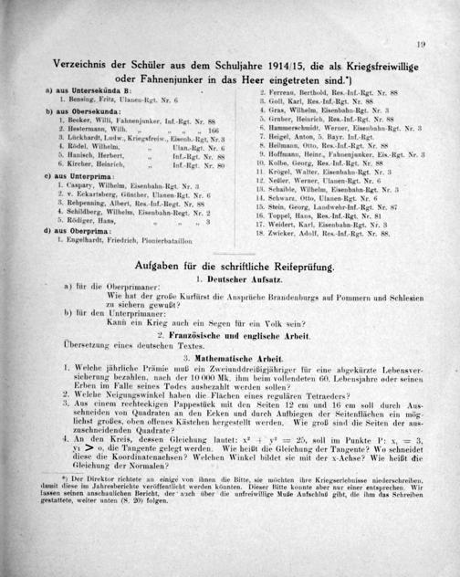 Verzeichnis der Schüler aus dem Schuljahre 1914/15, die als Kriegsfreiwillige