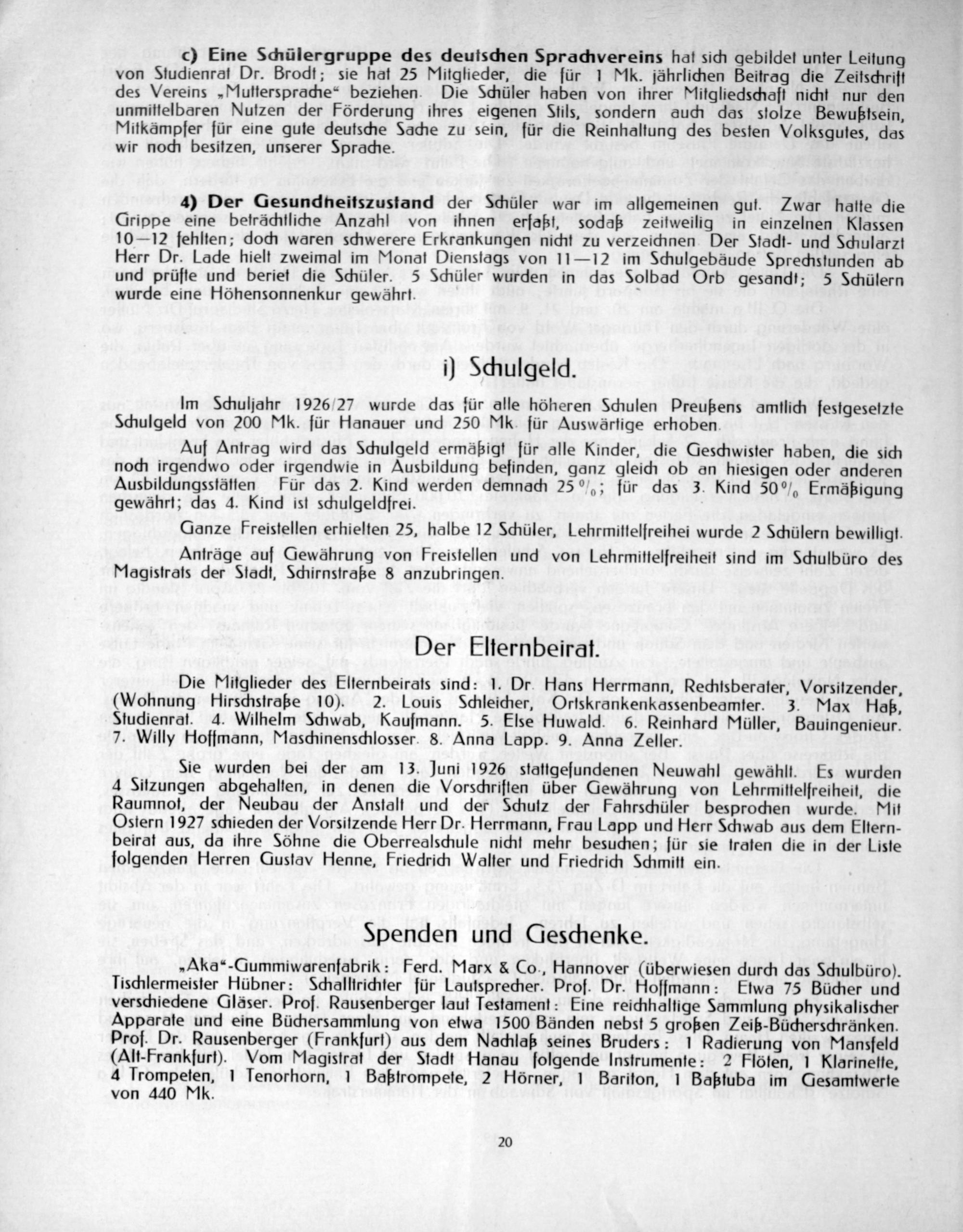im Schuljahr 1926,27 wurde das für alle höheren Schulen Preußens amtlich festgeselzfe Schulgeld von 200 Mk. für Hanauer und 250 Mk für Auswärfige erhoben.