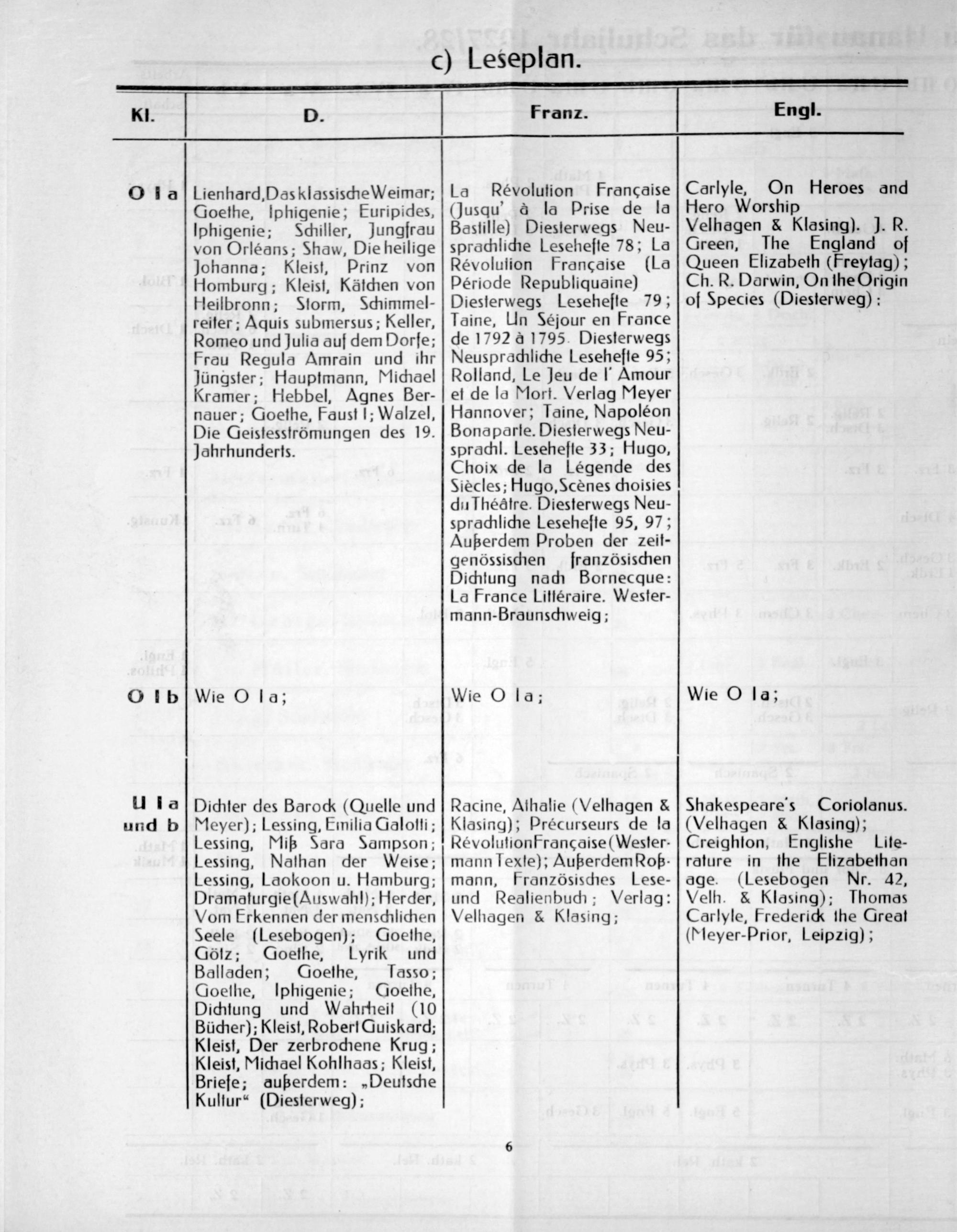 U Ia[Dichter des Barod(Quelle und] Racine, Afhalie(Velhagen&Shakespeare’s Coriolanus. und bMeyer): Lessing, Emilia Galoffi: Klasing); Précurseurs de la(Velhagen& Klasing); Lessing, Miß Sara Sampson; Révolufionfrançaise(Wester- Creighton, Englishe Lite- Lessing, Nathan der Weise; mann Texle); AußerdemRoß-rature in ihe Elizabethan Lessing, Laokoon u. Hamburg: mann, Französisches Lese-agHe.(Lesebogqen Nr. 42, Dramafurgie(Auswahl): Herder, und Realienbuch; Verlag: Velh.& Klasing): Thomas Vom Erkennen der menschlichen Velhagen& Klasing; Carlyle, Frederid ſhe Great Seele(Lesebogen); Goethe,(Neyer-Prior, Leipzig); Gölz; Goefhe, Lyrik und Balladen; CGoefhe, Iasso; Ooelhe, lphigenie; Goeihe, Dichtung und Wahrheit(10 Bücher); Kleist, Roberl Guiskard; Kleist, Der zerbrochene Krug; Kleist, Michael Kohlhaas; Kleist, Briefe; außerdem:„Deutsche Kultur“(Diesterweg):
