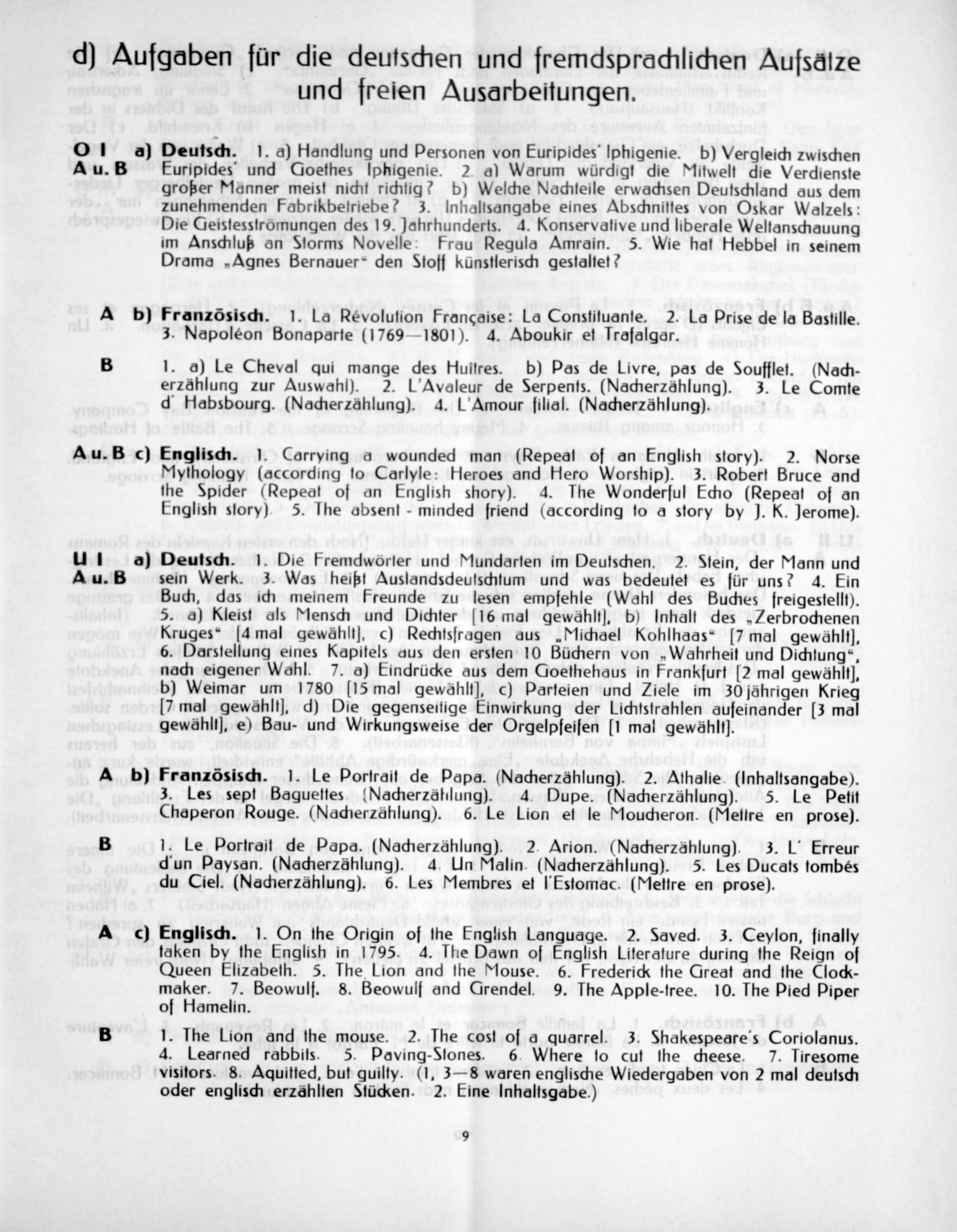 Deutsch. I. Die Fremdwörter und Mundarten im Deufschen. 2. Stein, der Mann und sein Werk. 3. Was heißt Auslandsdeufschtum und was bedeufef es für uns? 4. Ein Buch, das ich meinem Freunde zu lesen empfehle(Wahl des Buches freigestellt). 5. a) Kleist als Mensch und Dichter[16 mal gewählt], b) Inhalt des„Zerbrochenen Kruges“ ſd mal gewählt]. c) Rechtsfragen aus„Michdel Kohlhaas“[7 mal gewählt),. 6. Darstellung eines Kapitels aus den ersten 10 Büchern von„Wahcheit und Dichtung“, nach eigener Wahl. 7. a) Eindrücke aus dem Goethehaus in Frankfurt[2 mal gewählt], b) Weimar um 1780 lis mal gewählth c) Parteien und Ziele im 30 jährigen Krieg 7 mal gewählil, d) Die gegenseitige Einwirkung der Lidustrahlen aufeinander[3 mal Qewählt], e) Bau- und Wirkungsweise der Orgelpfeifen II mal gewählf].