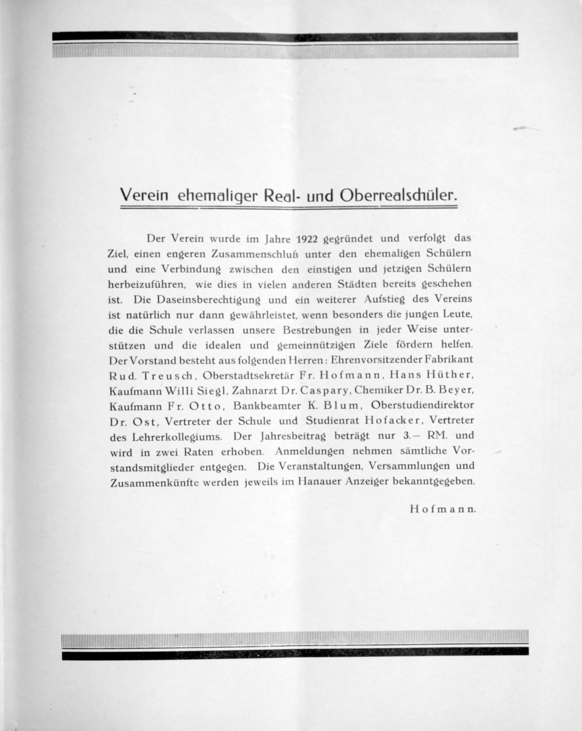 Der Verein wurde im Jahre 1922 gegründet und verfolgt das Ziel, einen engeren Zusammenschluß unter den ehemaligen Schülern und eine Verbindung zwischen den einstigen und jetzigen Schülern herbeizuführen, wie dies in vielen anderen Städten bereits geschehen ist. Die Daseinsberechtigung und ein weiterer Aufstieg des Vereins ist natürlich nur dann gewährleistet, wenn besonders die jungen Leute, die die Schule verlassen unsere Bestrebungen in jeder Weise unter- stützen und die idealen und gemeinnützigen Ziele fördern helfen. Der Vorstand besteht aus folgenden Herren: Ehrenvorsitzender Fabrikant Rud. Treusch, Oberstadtsekretär Fr. Hofmann, Hans Hüther, Kaufmann Willi Siegl, Zahnarzt Dr. Caspary, Chemiker Dr. B. Beyer, Kaufmann Fr. Otto, Bankbeamter K. Blum, Oberstudiendirektor Dr. Ost, Vertreter der Schule und Studienrat Hofacker, Vertreter des Lehrerkollegiums. Der Jahresbeitrag beträgt nur 3.— RM. und wird in zwei Raten erhoben. Anmeldungen nehmen sämtliche Vor- standsmitglieder entgegen. Die Veranstaltungen, Versammlungen und Zusammenkünfte werden jeweils im Hanauer Anzeiger bekanntgegeben.