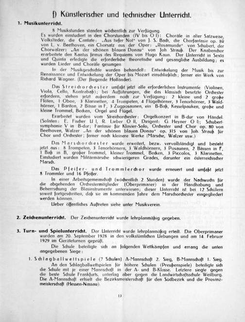 In einer Arbeitsgemeinschaft(wôchentlich 2 Stunden) wurde der Nochwuchs für die abgehenden Orchestermifglieder(Oberprimaner) in der Handhabung und Beherrschung der Blasinstrumente unterwiesen; dieser Unterricht ist bei 12 Schülern soweif fortgeschritten, daß sie im kommenden Jahre dem Marschorchester eingegliedert werden können.