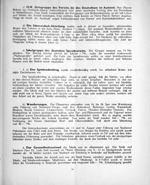 c) O-R. Ortsgruppe des Vereins für das Deufschtum im Ausland. Pierr Pſarrer Rehner aus Hamlesch-Amnas(Siebenbürgen) hiell einen fesselnden Vorfrag über das Deutschtum in Siebenbürgen. Zum Dank veranstallete die Ortsgruppe eine Büchersammſung, an der sich Lehrer und Schüler der Anstalt beteiligten, Eine statflidie Kiste konnte an Hierrn Pſarrer Rehner abgehen. Moôge ihr lnhalt der Ausdrud engen Verbundenseins von Hieimat und Auslandsdeutschtum Sein.