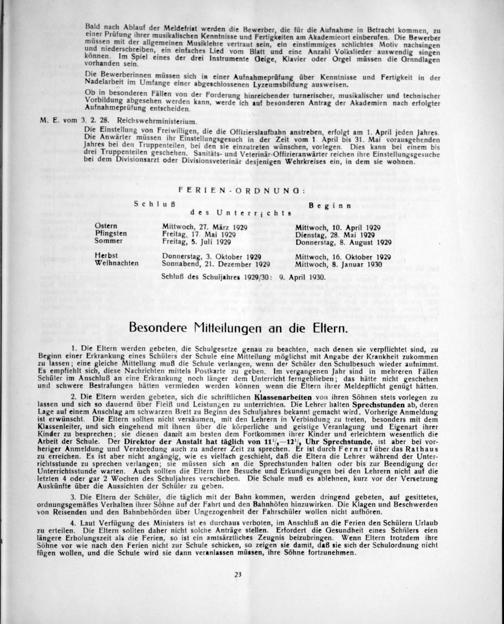 4. Laut Verfügung des Ministers ist es durchaus verboten, im Anschluß an die Ferien den Schülern Urlaub zu erteilen. Die Eltern sollten daher nicht solche Anträge stellen. Erfordert die Gesundheit eines Schülers eien längere Erholungszeit als die Ferien, so ist ein amtsärztliches Zeugnis beizubringen. Wenn Eltern trotzdem ihre Söhne vor wie nach den Ferien nicht zur Schule schicken, so zeigen sie damit, daß sie sich der Schulordnung nicht fügen wollen, und die Schule wird sie dann veranlassen müssen, ihre Söhne fortzunehmen.