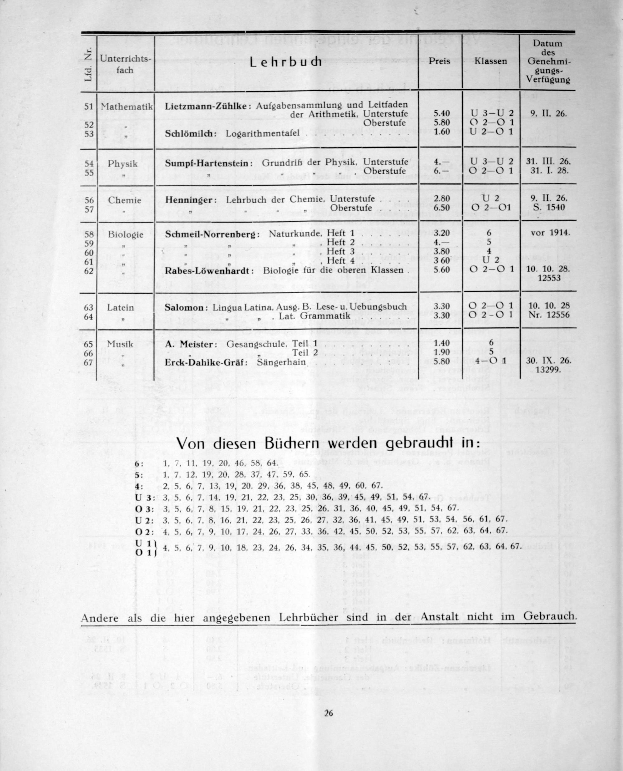 2 Untarrichts- Lehrbuch Preis Klassen Genehmi- 8 fach gungs- ₰ Verfügung 51 Mathematik Lietzmann-Zühlke: Aufgabensammlung und Leitfaden der Arithmetik, Unterstufe 5.40 U 3—U 2.. II. 26. 52 Oberstufe 5.80 O 2—0 1 53 Schlömilch: Logarithmentafel...... 1.60 U 2—0 1 54 Physik Sumpf-Hartenstein: Gruncris der Physik, Unterstufe 4.— U 3—U 2 31. III. 26. 55„„. Oberstufe 6.— O 2—0 1 VH3.1. I. 28. 56 Chemie Henninger: Lehrbuch der Chemie, Unterstufe. 2.80 U 2 9. II. 26. 57.„. Oberstufe 6.50 O 2—01 S. 1540 58 Biologie Schmeil-Norrenberg: Naturkunde, Heft 1 3.20 6 vor 1914. 59„„„„ Heft 2. 4.— 5 60.„.„ Heft 3.. 3.80 4 61.. Heft 4 3 60 U 2 62 Rabes-Löwenhardt: Biologie für die oberen Klassen 5 60 O 2—0 1ſ10. 10. 28. 12553 63 Latein Salomon: Lingua Latina, Ausg. B. Lese- u. Uebunesbuch 3.30 O 2—0 1 10. 10. 28 64„„„ Lat. Grammatik.. 3.30 O 2- O 1 Nr. 12556 65 Musik A. Meister: Gesangschule, Teil 1 1.40 6 66.„ Teil 2 1.90 5 67 Erck-Dahlke-Gräf: Sängerhain 5.80 4— O 1 30. IX. 26. 13299. Von diesen Büchern werden gebraucht in: 6: 1. 7. 11, 19. 20. 46, 58, 64. 5: 1.7, 12, 19. 20. 28. 37, 47, 59. 65 4: 2. 5. 6, 7. 13, 19, 20. 29, 36. 38. 45,. 48. 49. 60. 67. U 3: 3., 5. 6. 7. 14, 19, 21. 22. 23, 25. 30. 36. 39. 45,. 49. 51. 54. 67. O0 3: 3, 5. 6. 7. 8. 15. 19, 21, 22, 23, 25. 25. 31. 36, 40, 45. 49. 51. 54, 67. U 2: 3. P5, 6. 7. 8. 16. 21. 22, 23, 25, 26, 27, 32. 36. 41. 45. 49. 51. 53. 54,. 56, 61, 67. 02: 4. 5, 6, 7,. 9. 10. 17, 24. 26, 27, 33. 36. 42. 45. 50, 52. 53. 55. 57, 62. 63, 64, 67. 9 1) 4. 5. 6, 7, 9. 10. 18. 23, 24. 26. 34, 35, 36, 44. 45, 50. 52. 53, 55. 57, 62. 63, 64, 67. Andere als die hier angegebenen Lehrbücher sind in der Anstalt nicht im Gebrauch.