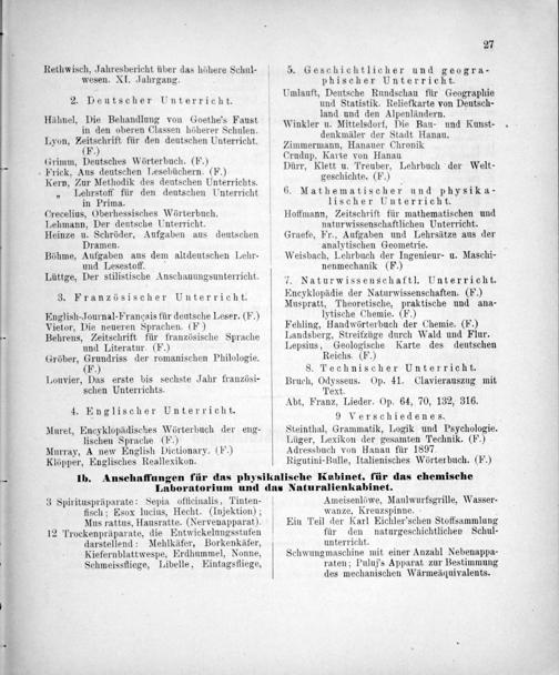 7. Naturwissenschaftl. Unterricht. Encyklopädie der Naturwissenschaften.(F.) Muspratt, Theoretische, praktische und ana- lytische Chemie.(F.) Fehling, Handwörterbuch der Chemie.(F.) Landsberg, Streifzüge durch Wald und Flur. Lepsius, Geologische Karte des deutschen Reichs.(F.) 8. Technischer Bruch, Odysseus. Op. 41. Text. Abt, Franz, Lieder. Op. 64, 70, 132, 9 Verschiedenes.. Steinthal, Grammatik, Logik und Psychologie. Lüger, Lexikon der gesamten Technik.(F.) Adressbuch von Hanau für 1897. Rigutini-Bulle, Italienisches Wörterbuch.(F.)